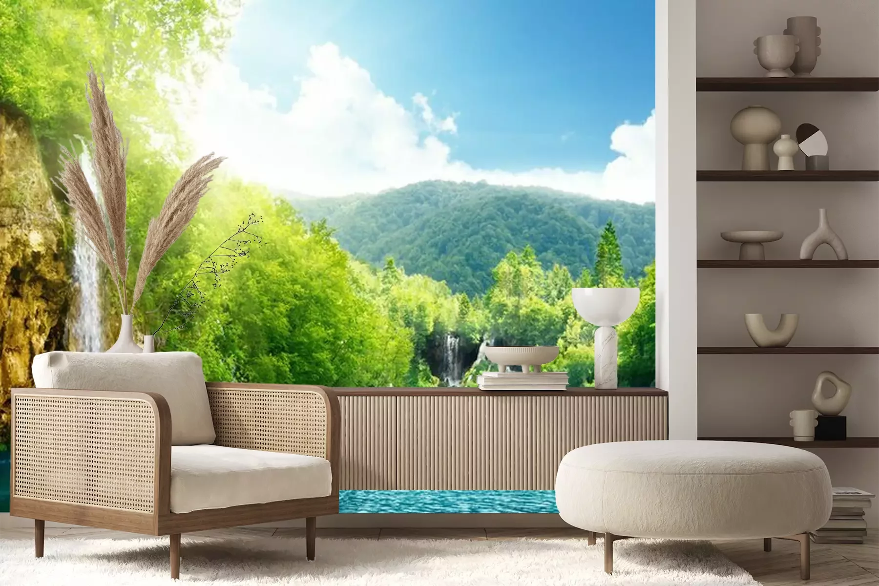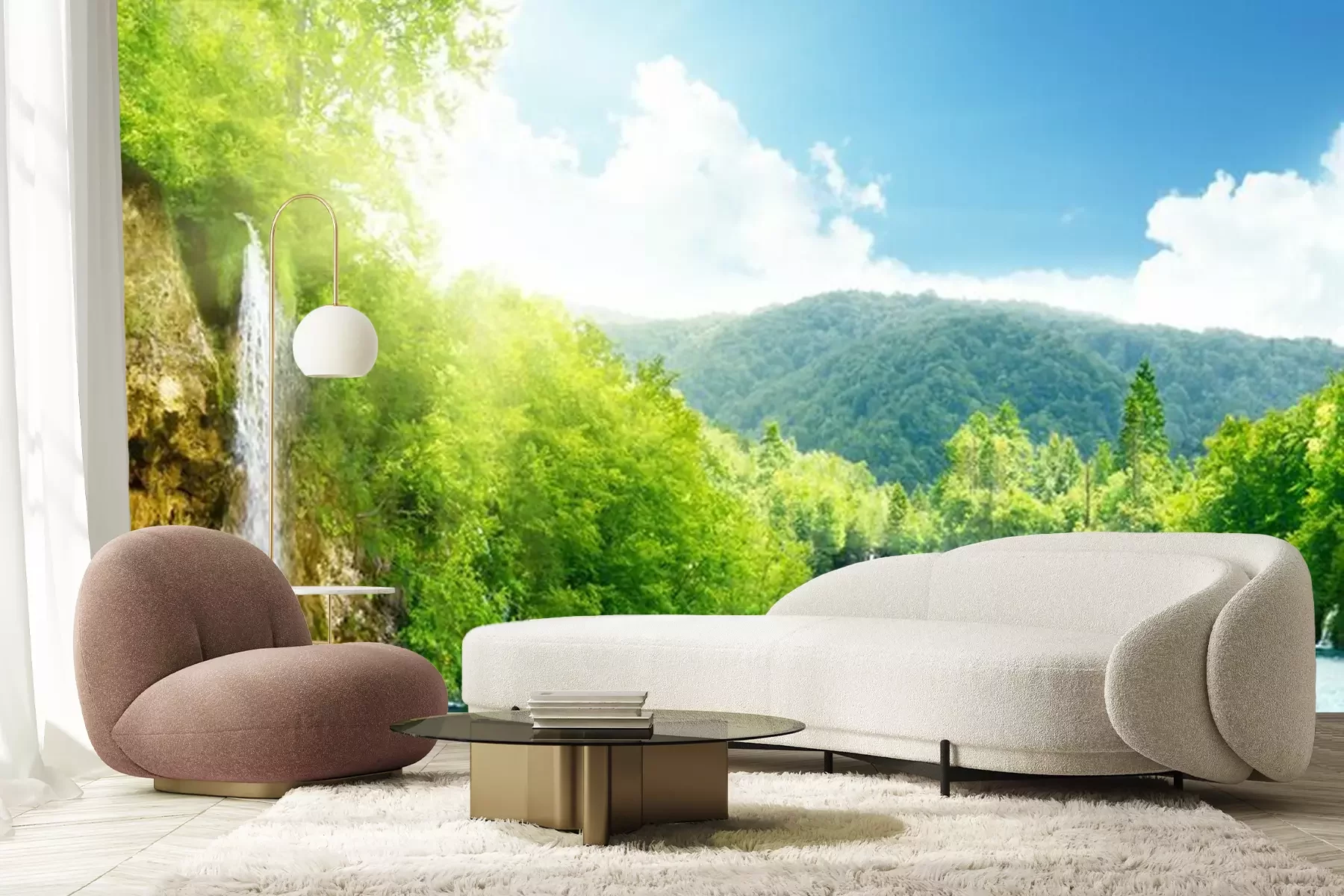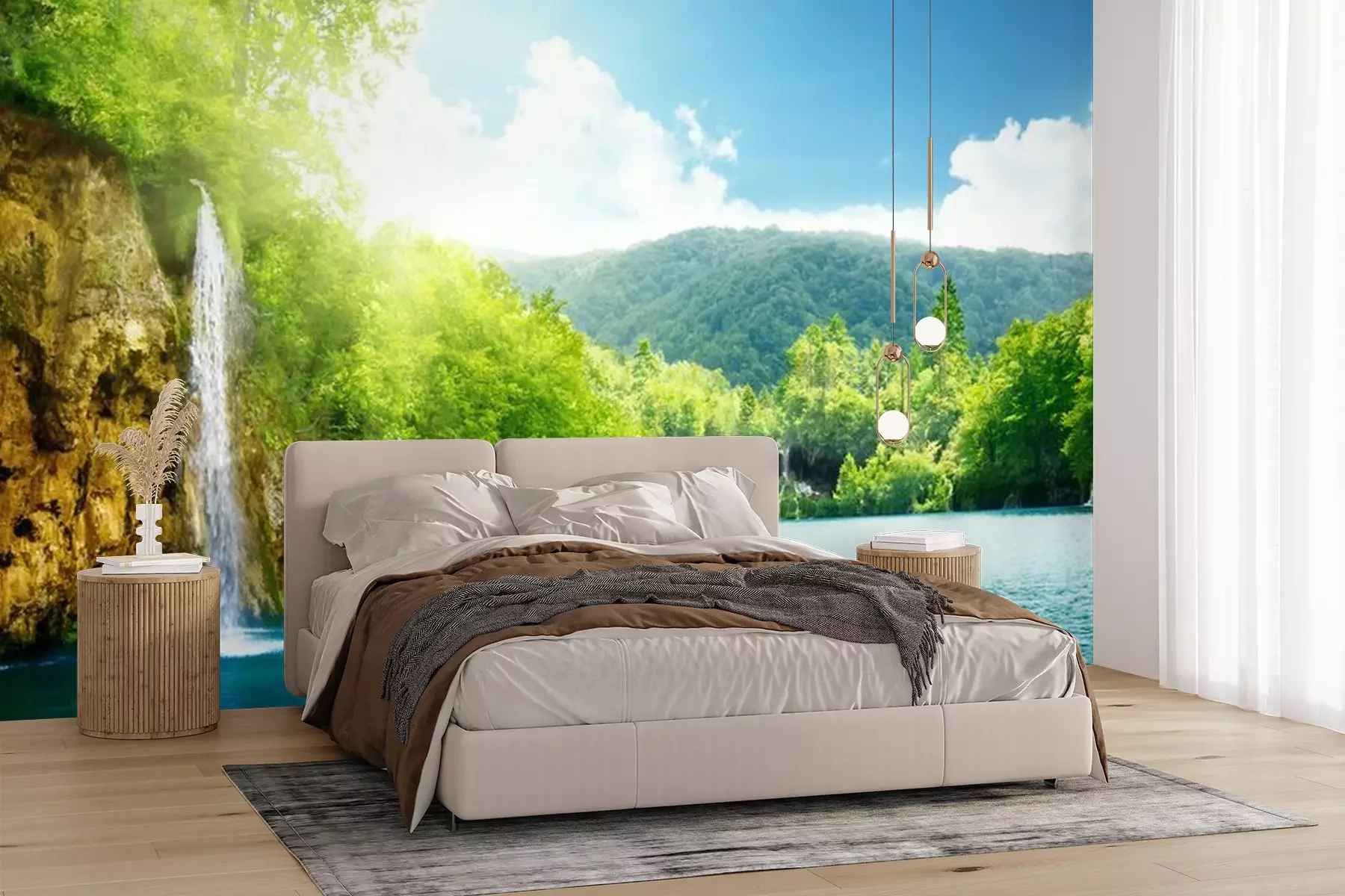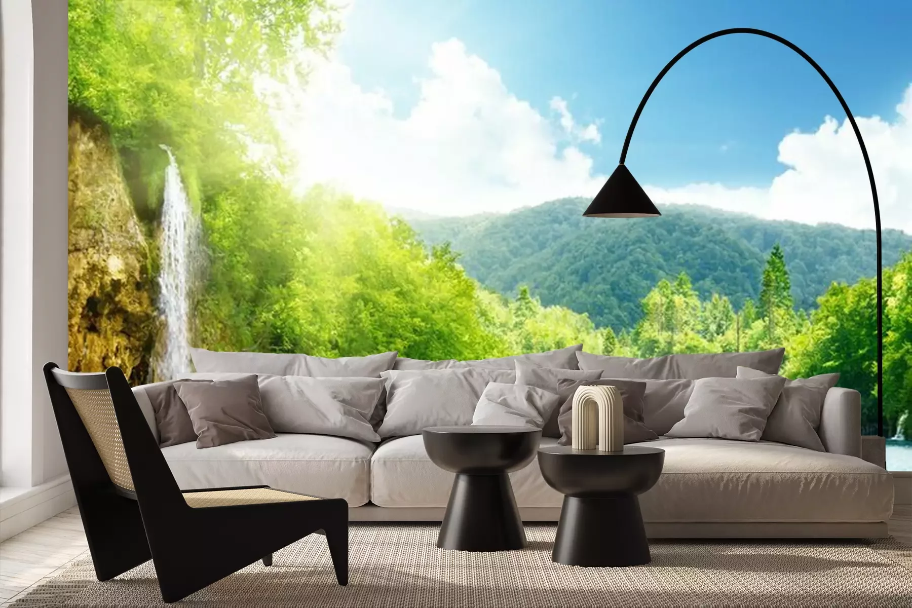 Zonnig bos en watervalProbleemloze bezorging verzorgd door vertrouwde vervoerders