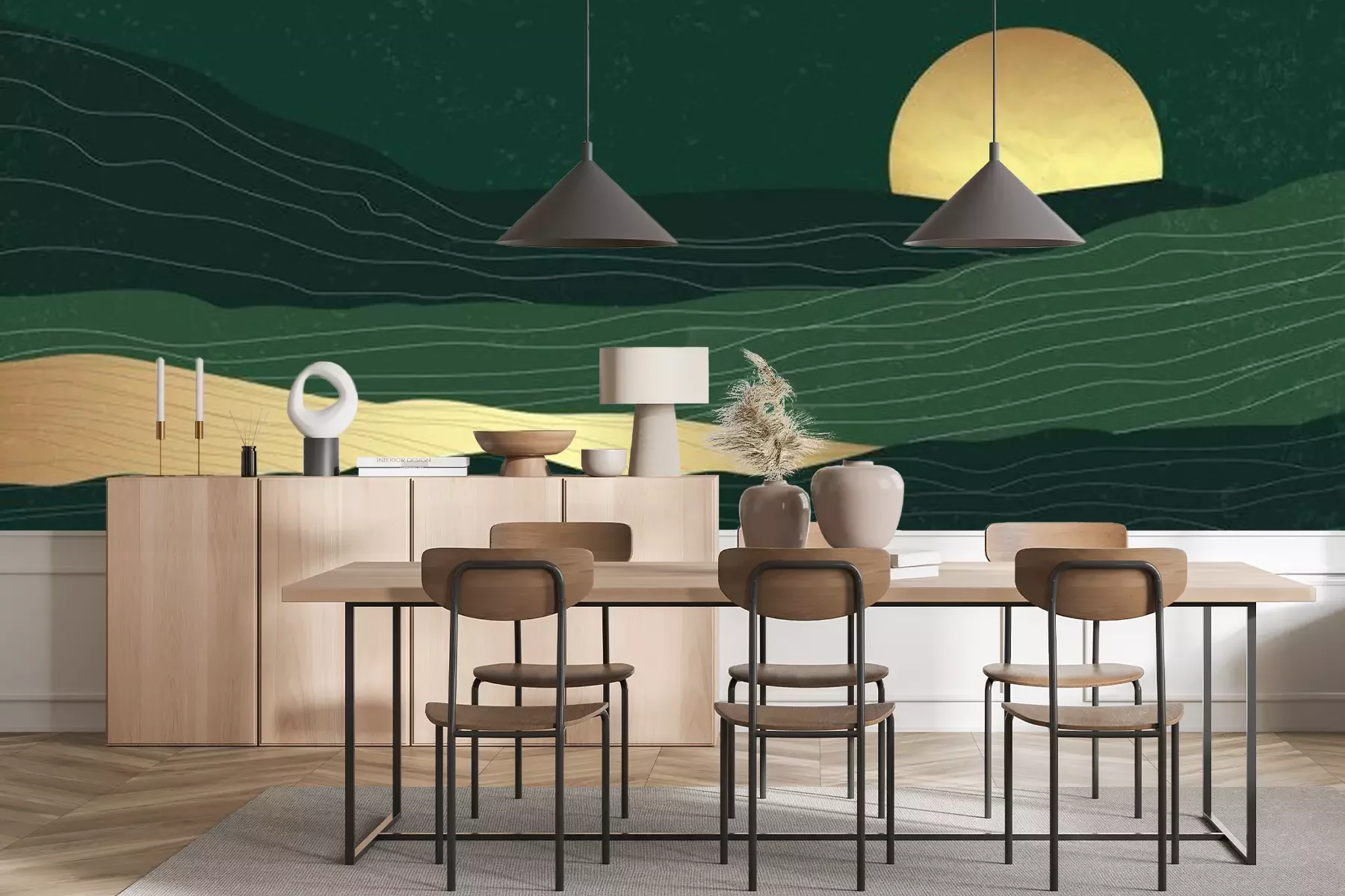 Fotobehang Berglandschap met ondergaande maan in moderne stijl