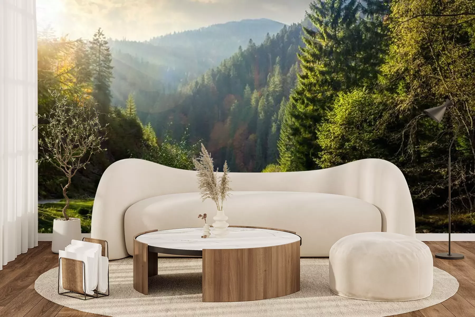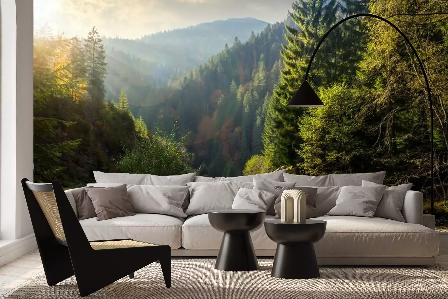 Zonsopgang boven een naaldbos in de mistProbleemloze bezorging verzorgd door vertrouwde vervoerders