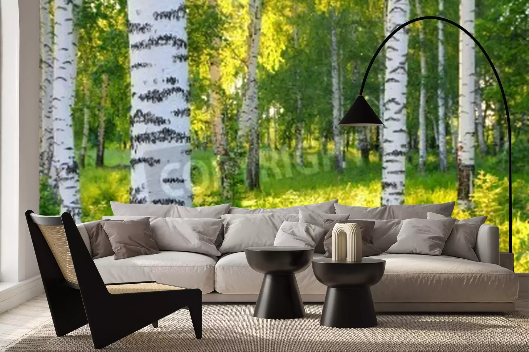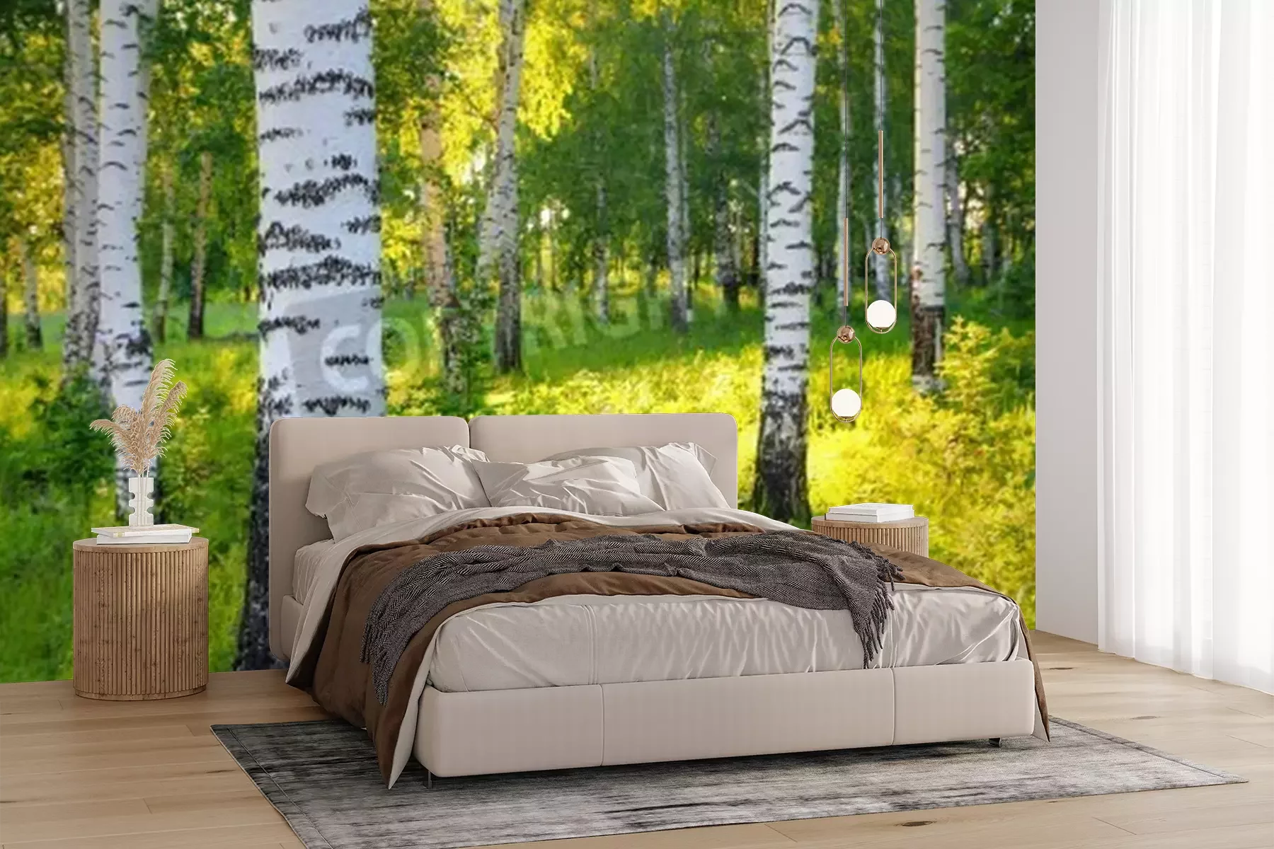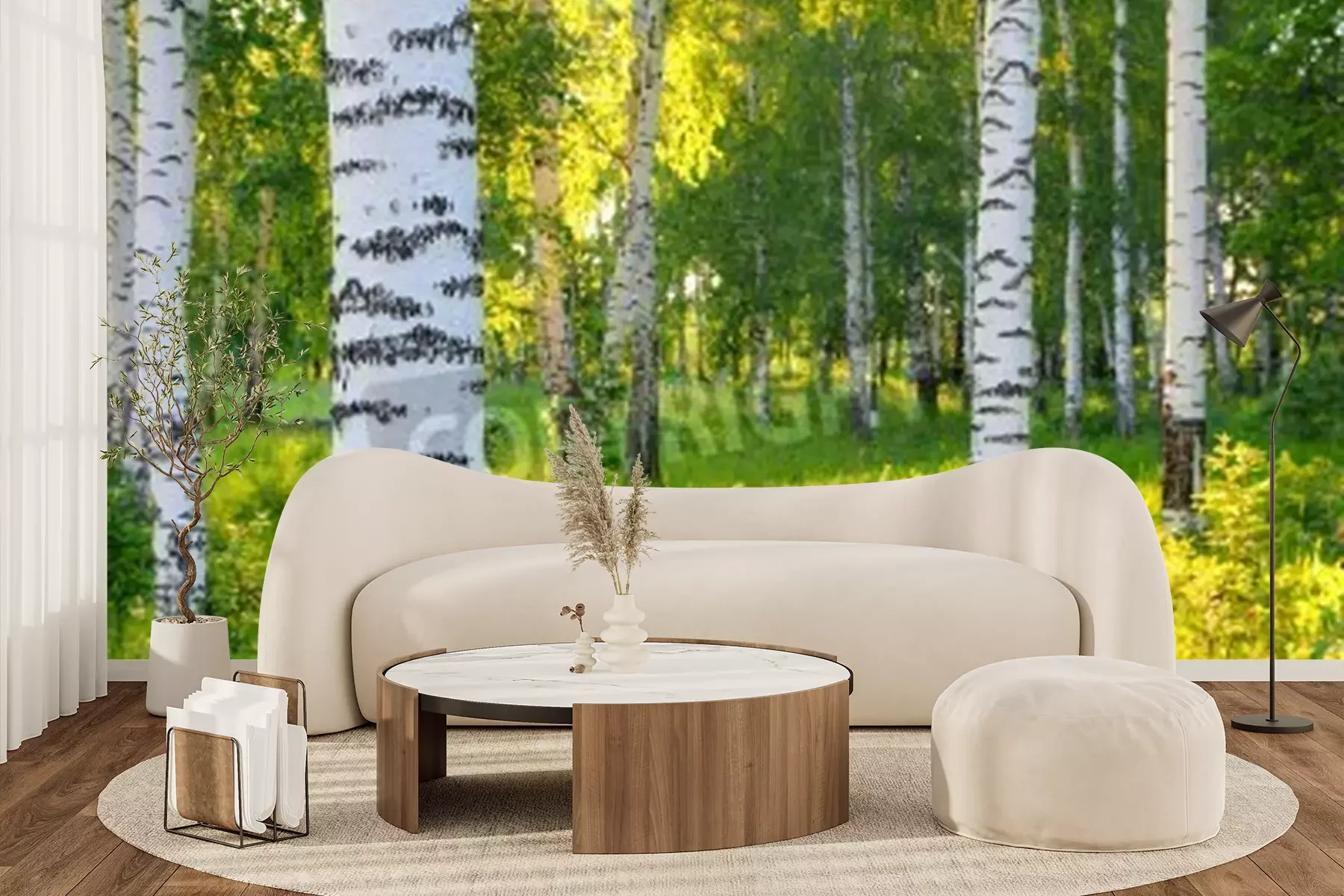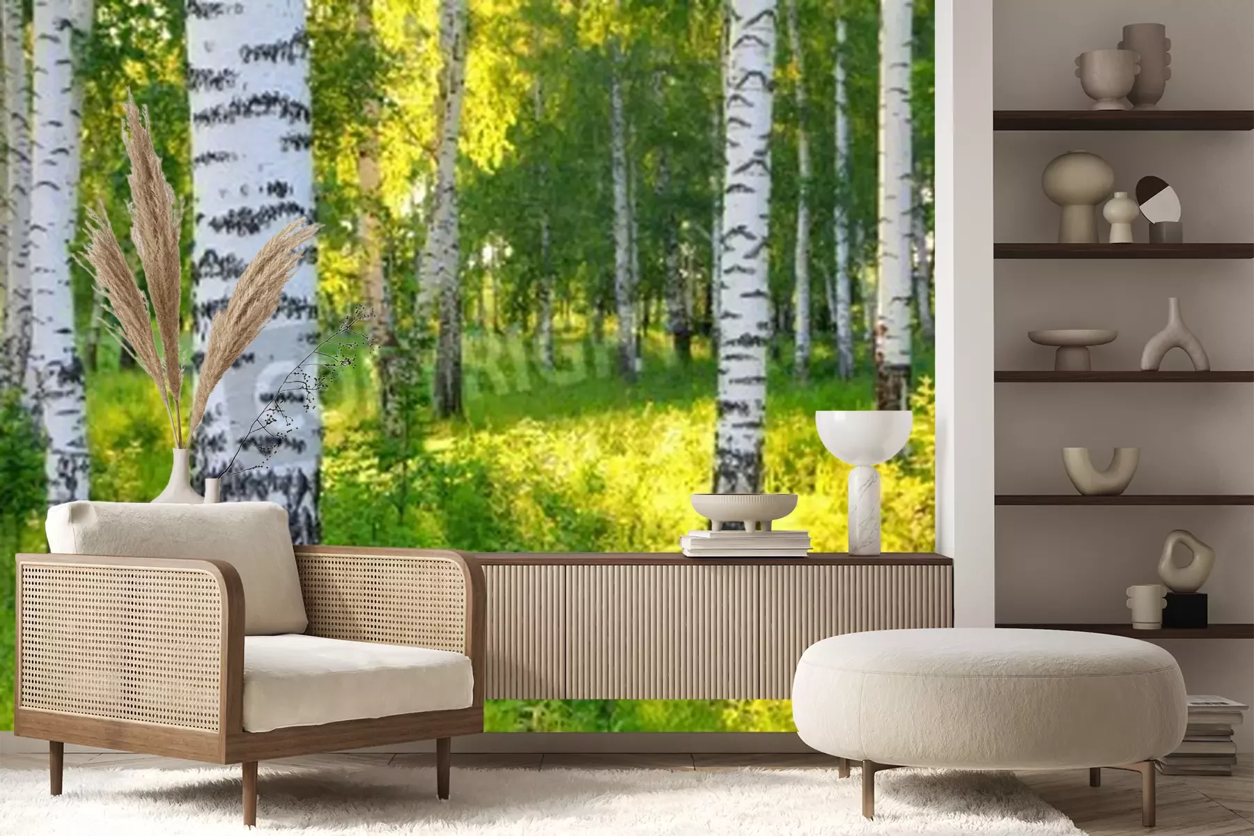 Fotobehang Berken bij groen gras