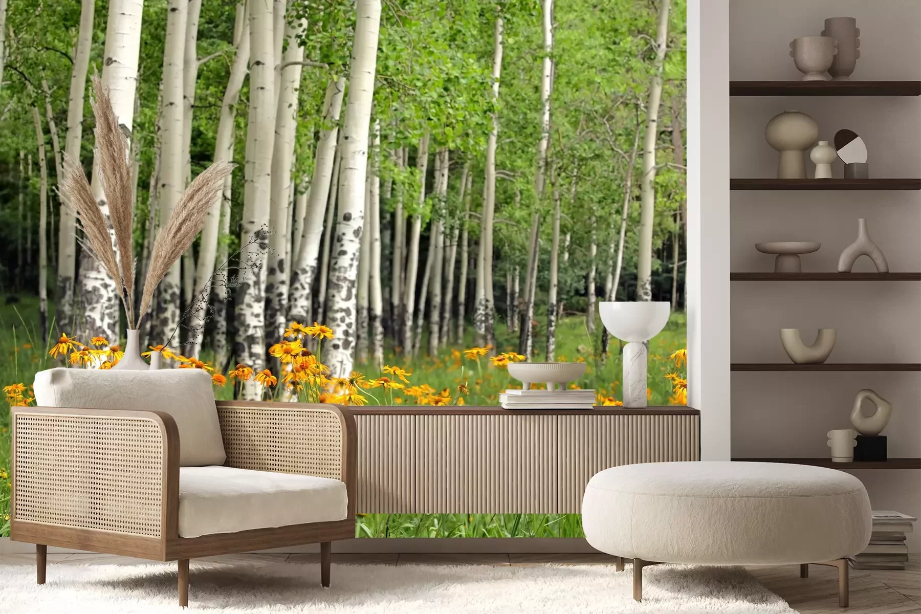 Het materiaal Premium+ is een gestructureerd vinyl op vlies met een gewicht van 255 g/m², dat kleine oneffenheden in de muur effectief camoufleert. De subtiele structuur van fijn zand geeft het oppervlak een exclusieve uitstraling, terwijl de halfmatte afwerking de diepte van de kleuren benadrukt. Het materiaal is dampdoorlatend, waardoor het ook in de keuken en badkamer kan worden gebruikt. De maximale breedte van één baan bedraagt 100 cm – bij grotere afmetingen wordt het fotobehang in meerdere gelijke banen verdeeld. De lijm wordt direct op de muur aangebracht en het behang wordt rand-aan-rand geplakt, wat zorgt voor een esthetisch resultaat zonder zichtbare naden. Het oppervlak kan gemakkelijk worden schoongemaakt door het voorzichtig af te nemen met een vochtige doek.