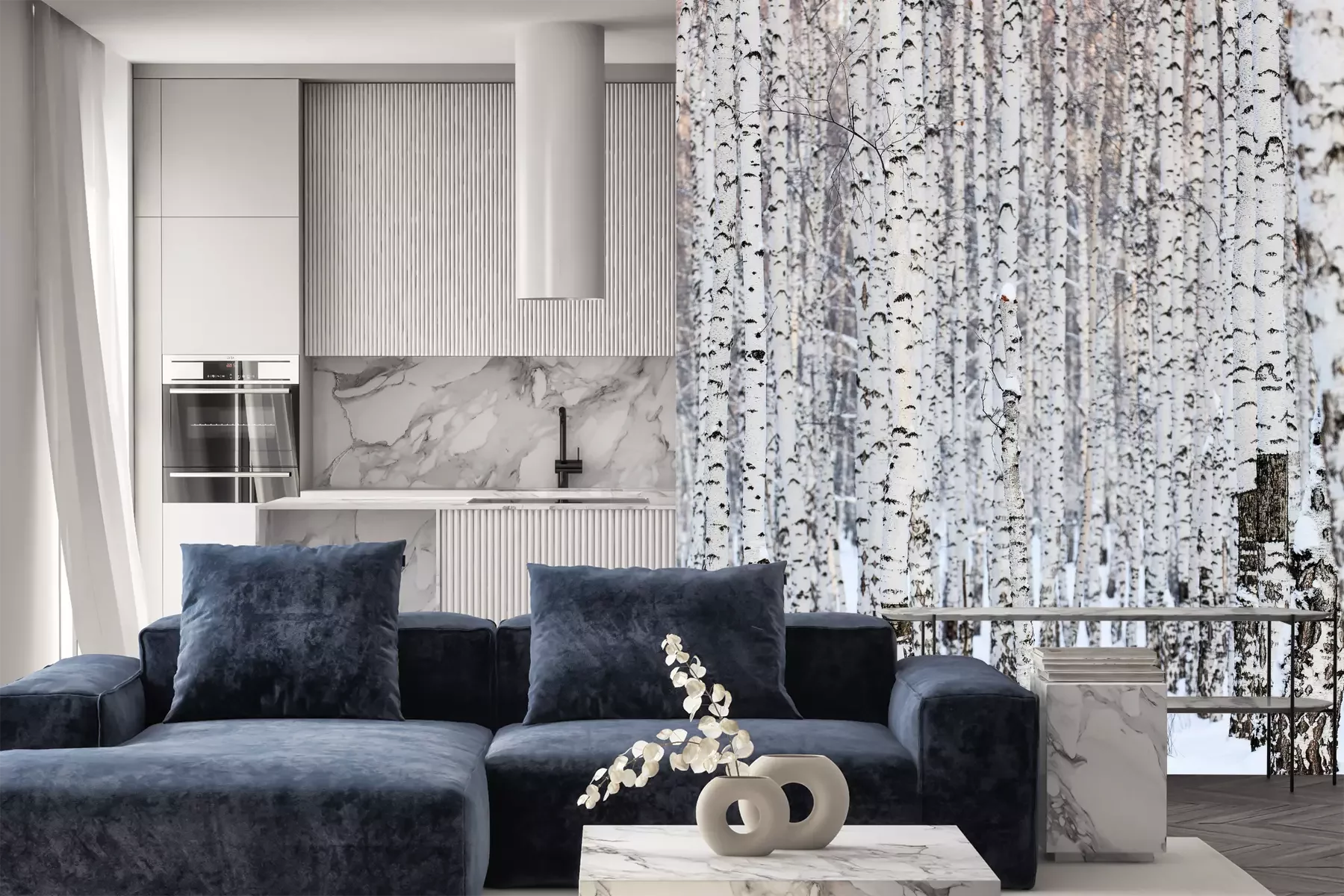 Het materiaal Premium is een glad vinyl op vlies, dat bestand is tegen uitrekken en vervorming. Het is dampdoorlatend – de muren kunnen vrij ademen – waardoor het geschikt is voor gebruik in de keuken en badkamer. Bij vervuiling kan het materiaal worden afgenomen met een vochtige doek. De maximale breedte van één baan bedraagt 95 of 105 cm, afhankelijk van de beschikbaarheid. Montage vindt plaats met de rand-aan-rand methode, wat een esthetisch resultaat zonder zichtbare naden oplevert. Omdat de lijm rechtstreeks op de muur wordt aangebracht, verloopt de installatie van het fotobehang snel en eenvoudig.