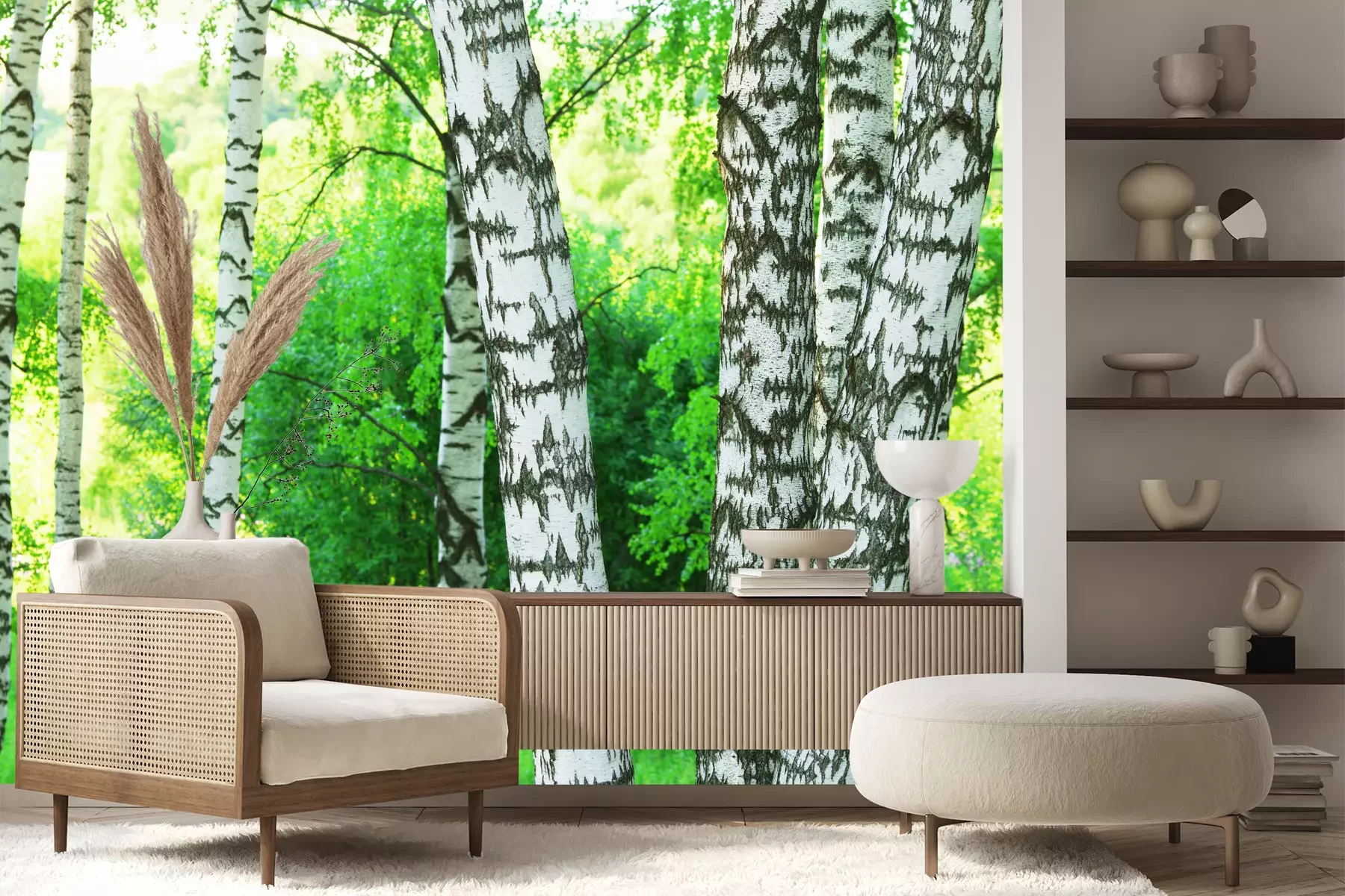 Het materiaal Premium+ is een gestructureerd vinyl op vlies met een gewicht van 255 g/m², dat kleine oneffenheden in de muur effectief camoufleert. De subtiele structuur van fijn zand geeft het oppervlak een exclusieve uitstraling, terwijl de halfmatte afwerking de diepte van de kleuren benadrukt. Het materiaal is dampdoorlatend, waardoor het ook in de keuken en badkamer kan worden gebruikt. De maximale breedte van één baan bedraagt 100 cm – bij grotere afmetingen wordt het fotobehang in meerdere gelijke banen verdeeld. De lijm wordt direct op de muur aangebracht en het behang wordt rand-aan-rand geplakt, wat zorgt voor een esthetisch resultaat zonder zichtbare naden. Het oppervlak kan gemakkelijk worden schoongemaakt door het voorzichtig af te nemen met een vochtige doek.