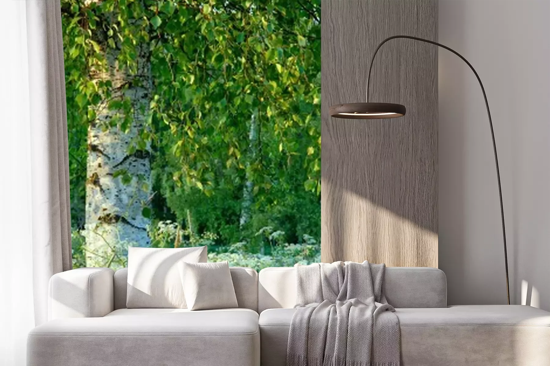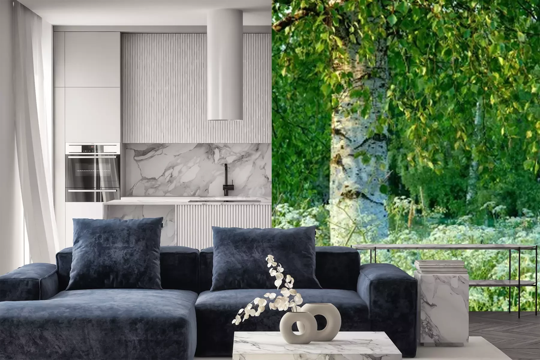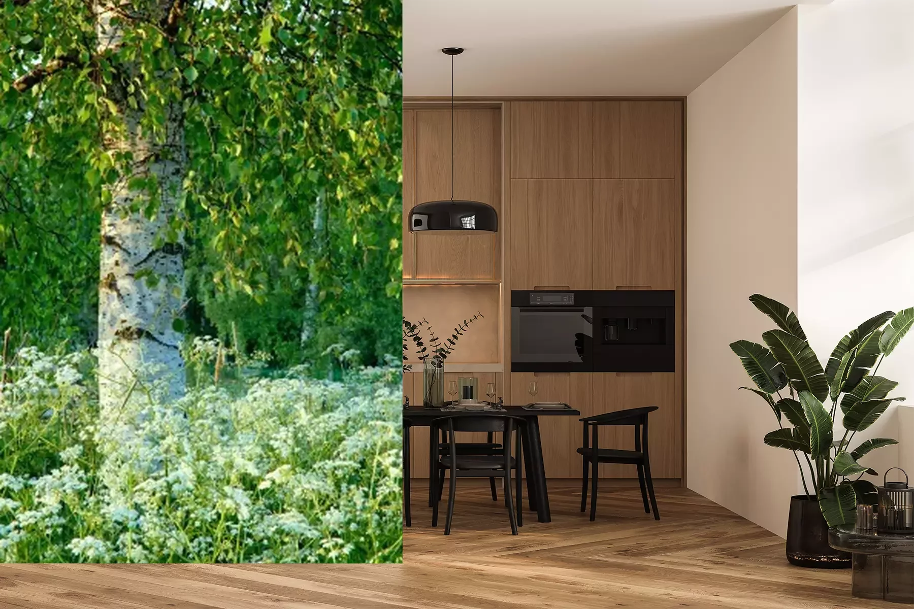 Fotobehang Berkenboom en veldbloemen