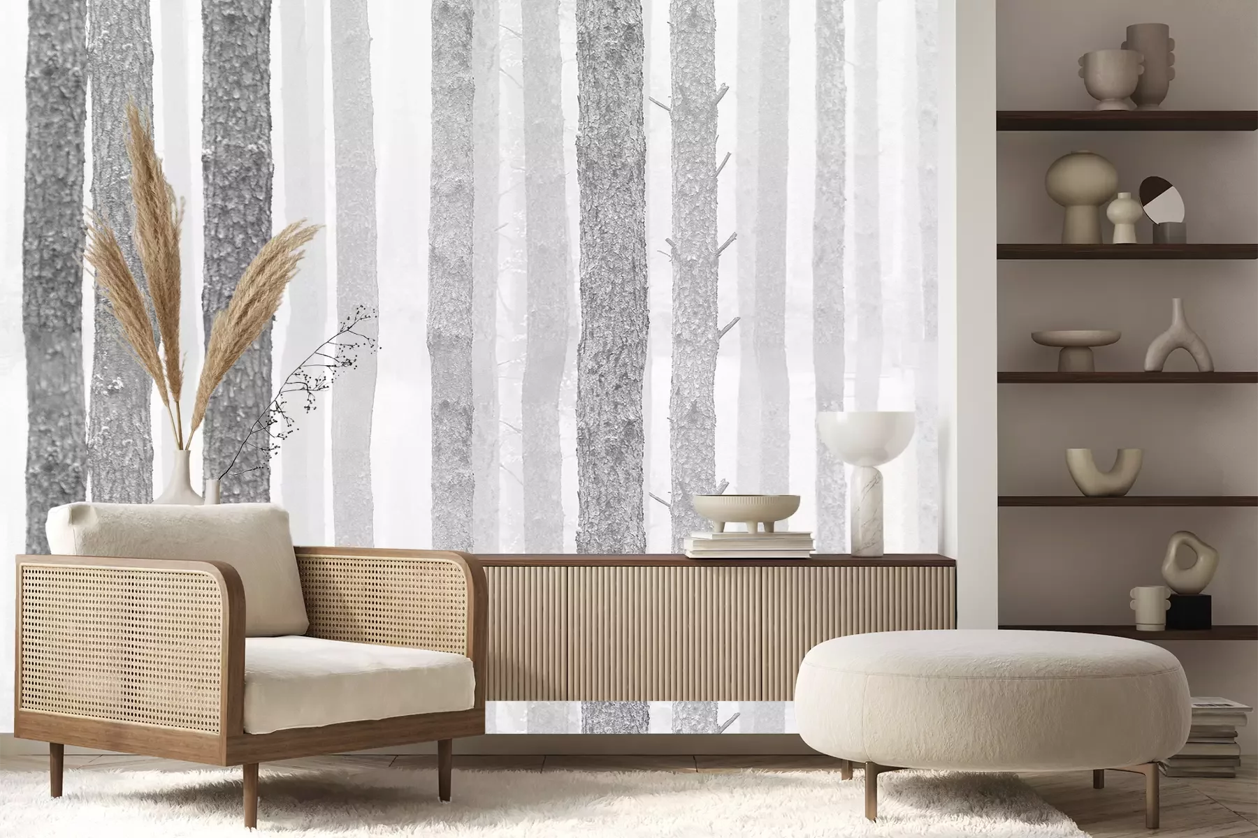Het materiaal Premium+ is een gestructureerd vinyl op vlies met een gewicht van 255 g/m², dat kleine oneffenheden in de muur effectief camoufleert. De subtiele structuur van fijn zand geeft het oppervlak een exclusieve uitstraling, terwijl de halfmatte afwerking de diepte van de kleuren benadrukt. Het materiaal is dampdoorlatend, waardoor het ook in de keuken en badkamer kan worden gebruikt. De maximale breedte van één baan bedraagt 100 cm – bij grotere afmetingen wordt het fotobehang in meerdere gelijke banen verdeeld. De lijm wordt direct op de muur aangebracht en het behang wordt rand-aan-rand geplakt, wat zorgt voor een esthetisch resultaat zonder zichtbare naden. Het oppervlak kan gemakkelijk worden schoongemaakt door het voorzichtig af te nemen met een vochtige doek.