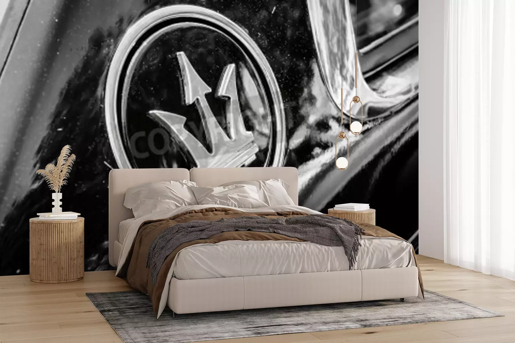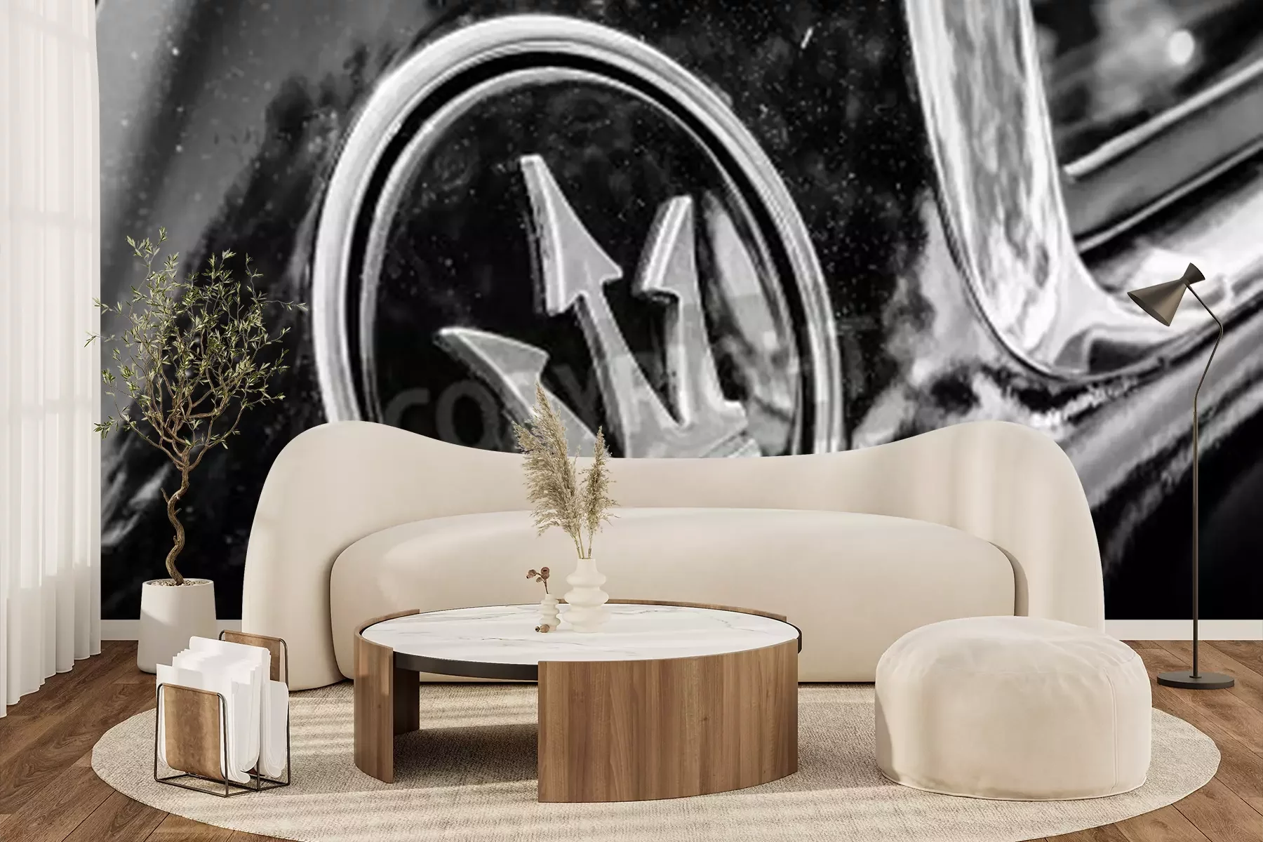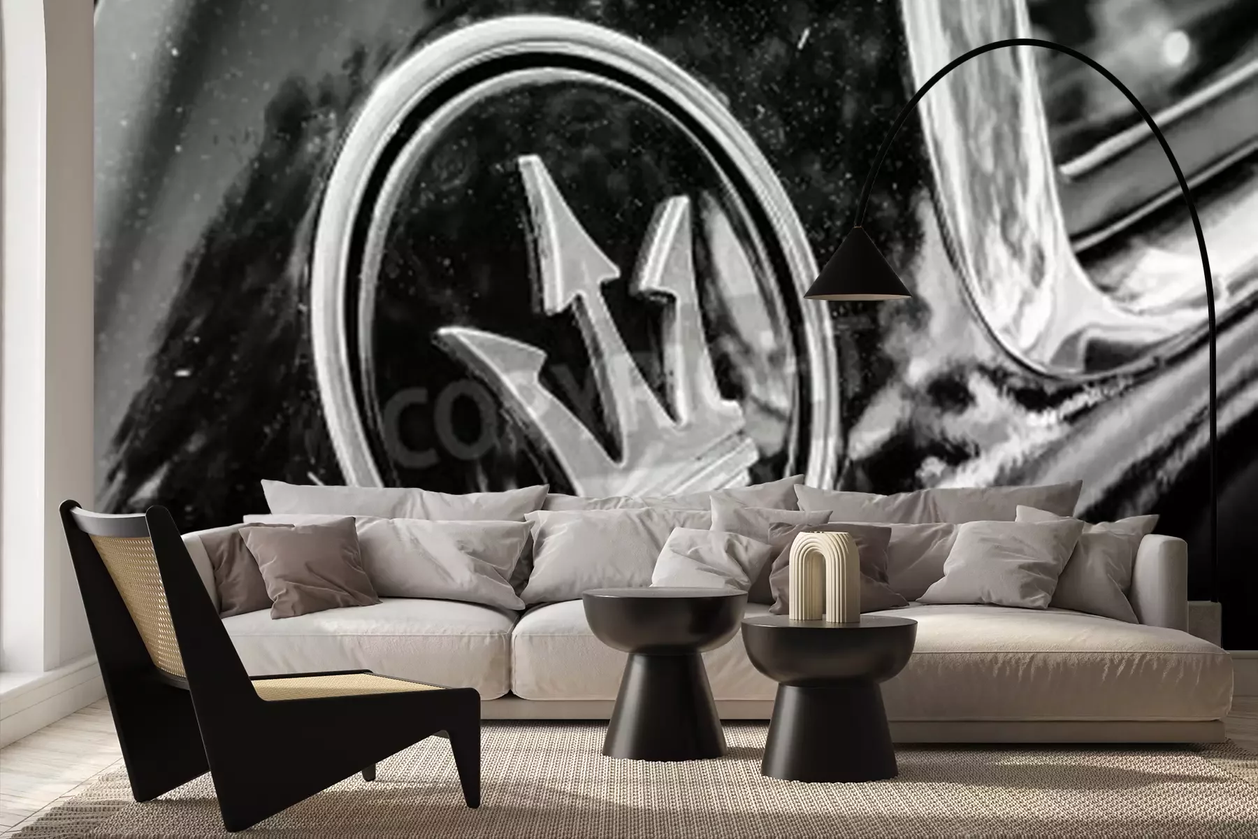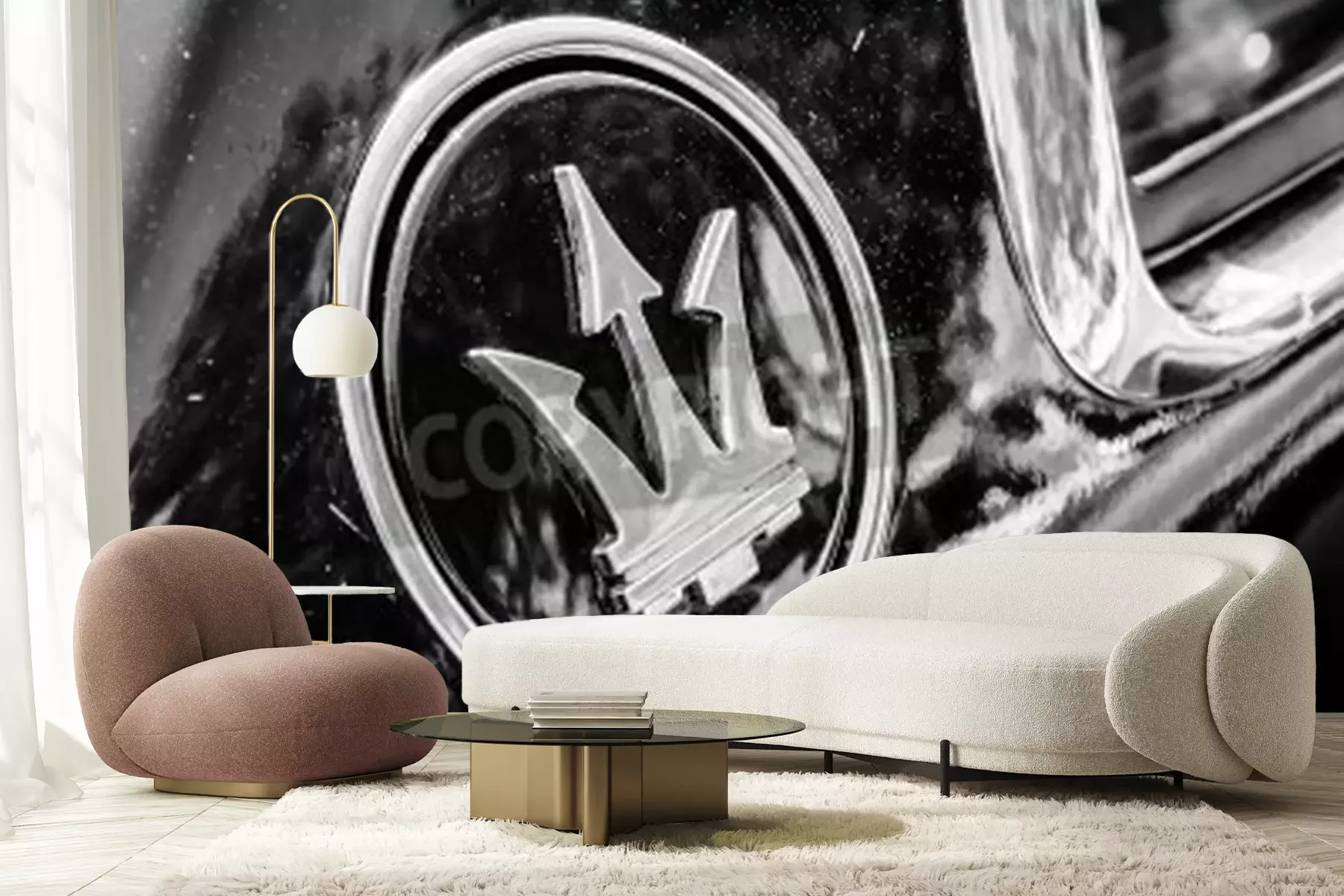 Fotobehang Berlijn, Duitsland - 17 mei 2014: Maserati auto embleem. Zwart en wit. 27e Oldtimer Dag Berlijn - Brandenburg