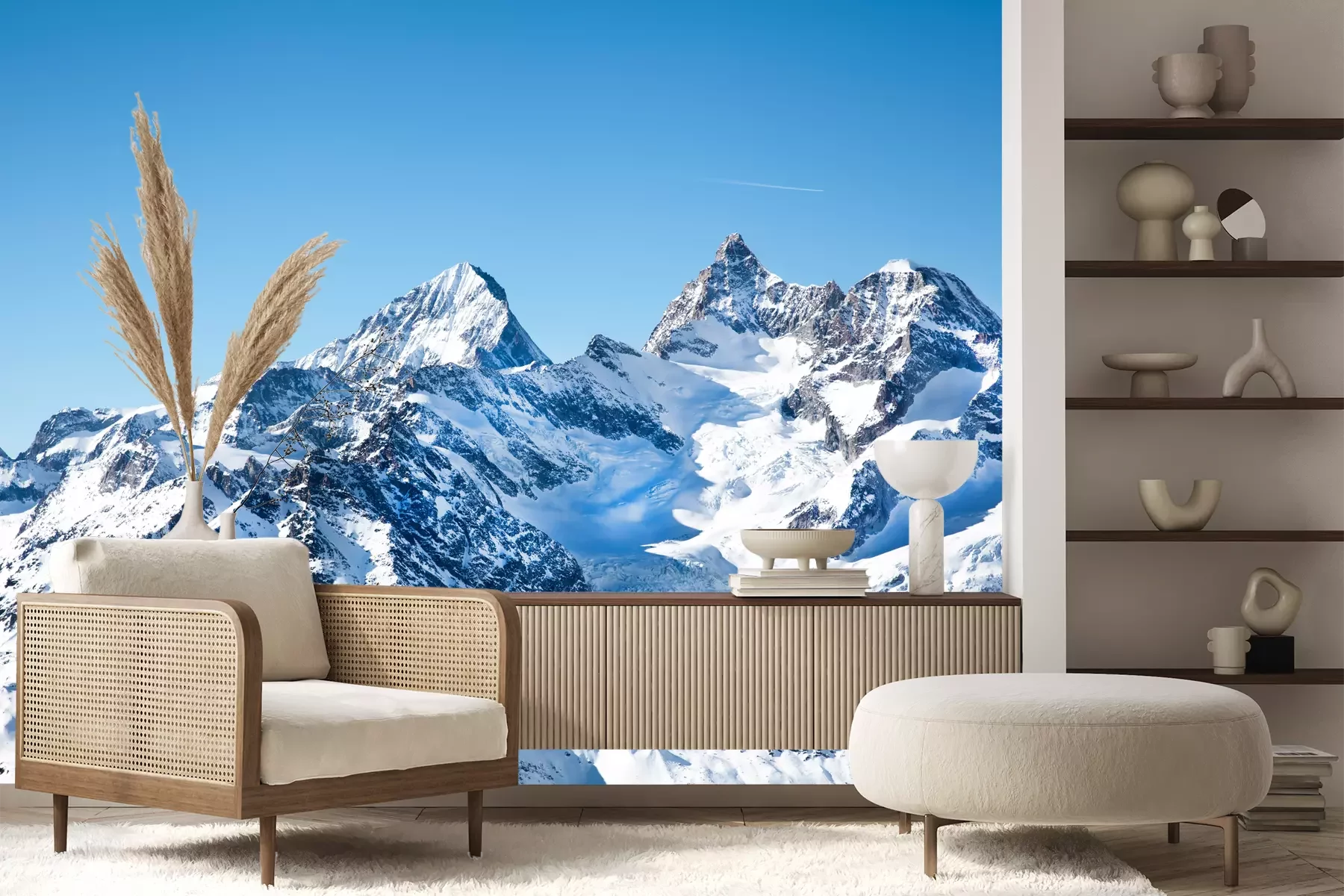 Het materiaal Premium+ is een gestructureerd vinyl op vlies met een gewicht van 255 g/m², dat kleine oneffenheden in de muur effectief camoufleert. De subtiele structuur van fijn zand geeft het oppervlak een exclusieve uitstraling, terwijl de halfmatte afwerking de diepte van de kleuren benadrukt. Het materiaal is dampdoorlatend, waardoor het ook in de keuken en badkamer kan worden gebruikt. De maximale breedte van één baan bedraagt 100 cm – bij grotere afmetingen wordt het fotobehang in meerdere gelijke banen verdeeld. De lijm wordt direct op de muur aangebracht en het behang wordt rand-aan-rand geplakt, wat zorgt voor een esthetisch resultaat zonder zichtbare naden. Het oppervlak kan gemakkelijk worden schoongemaakt door het voorzichtig af te nemen met een vochtige doek.