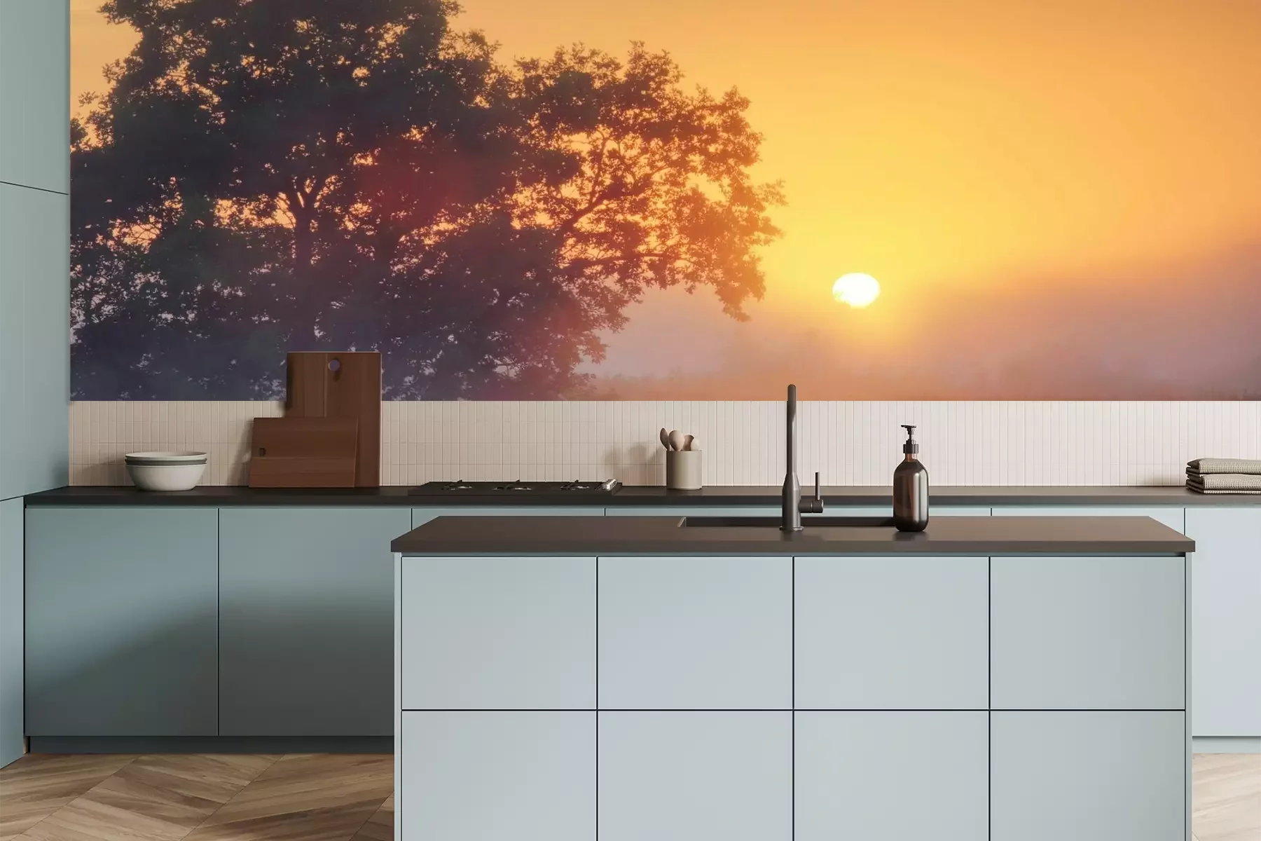 Het materiaal Premium is een glad vinyl op vlies, dat bestand is tegen uitrekken en vervorming. Het is dampdoorlatend – de muren kunnen vrij ademen – waardoor het geschikt is voor gebruik in de keuken en badkamer. Bij vervuiling kan het materiaal worden afgenomen met een vochtige doek. De maximale breedte van één baan bedraagt 95 of 105 cm, afhankelijk van de beschikbaarheid. Montage vindt plaats met de rand-aan-rand methode, wat een esthetisch resultaat zonder zichtbare naden oplevert. Omdat de lijm rechtstreeks op de muur wordt aangebracht, verloopt de installatie van het fotobehang snel en eenvoudig.