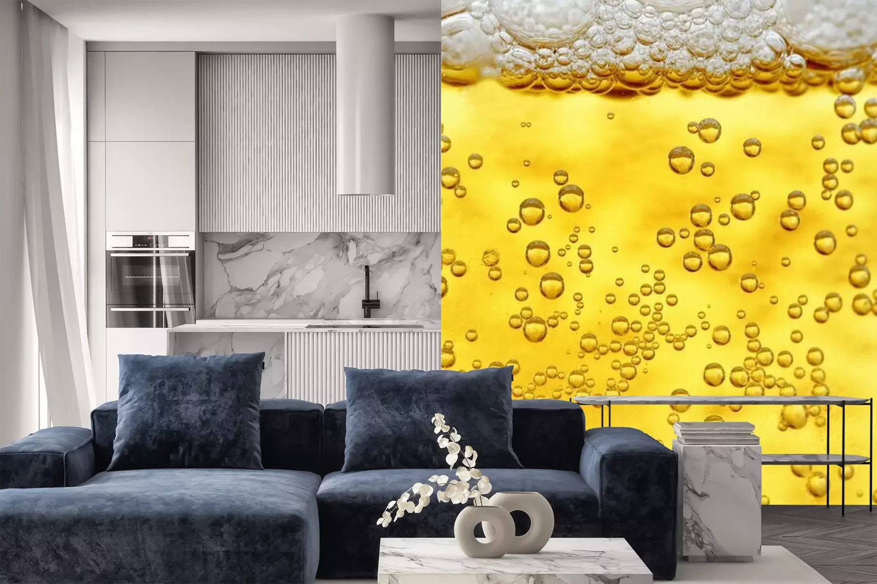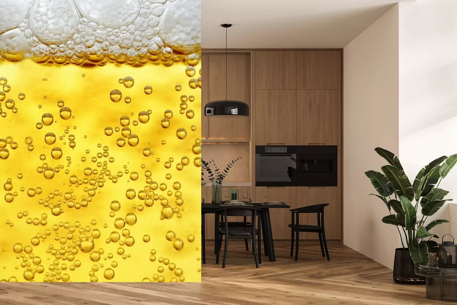 Het materiaal Premium is een glad vinyl op vlies, dat bestand is tegen uitrekken en vervorming. Het is dampdoorlatend – de muren kunnen vrij ademen – waardoor het geschikt is voor gebruik in de keuken en badkamer. Bij vervuiling kan het materiaal worden afgenomen met een vochtige doek. De maximale breedte van één baan bedraagt 95 of 105 cm, afhankelijk van de beschikbaarheid. Montage vindt plaats met de rand-aan-rand methode, wat een esthetisch resultaat zonder zichtbare naden oplevert. Omdat de lijm rechtstreeks op de muur wordt aangebracht, verloopt de installatie van het fotobehang snel en eenvoudig.