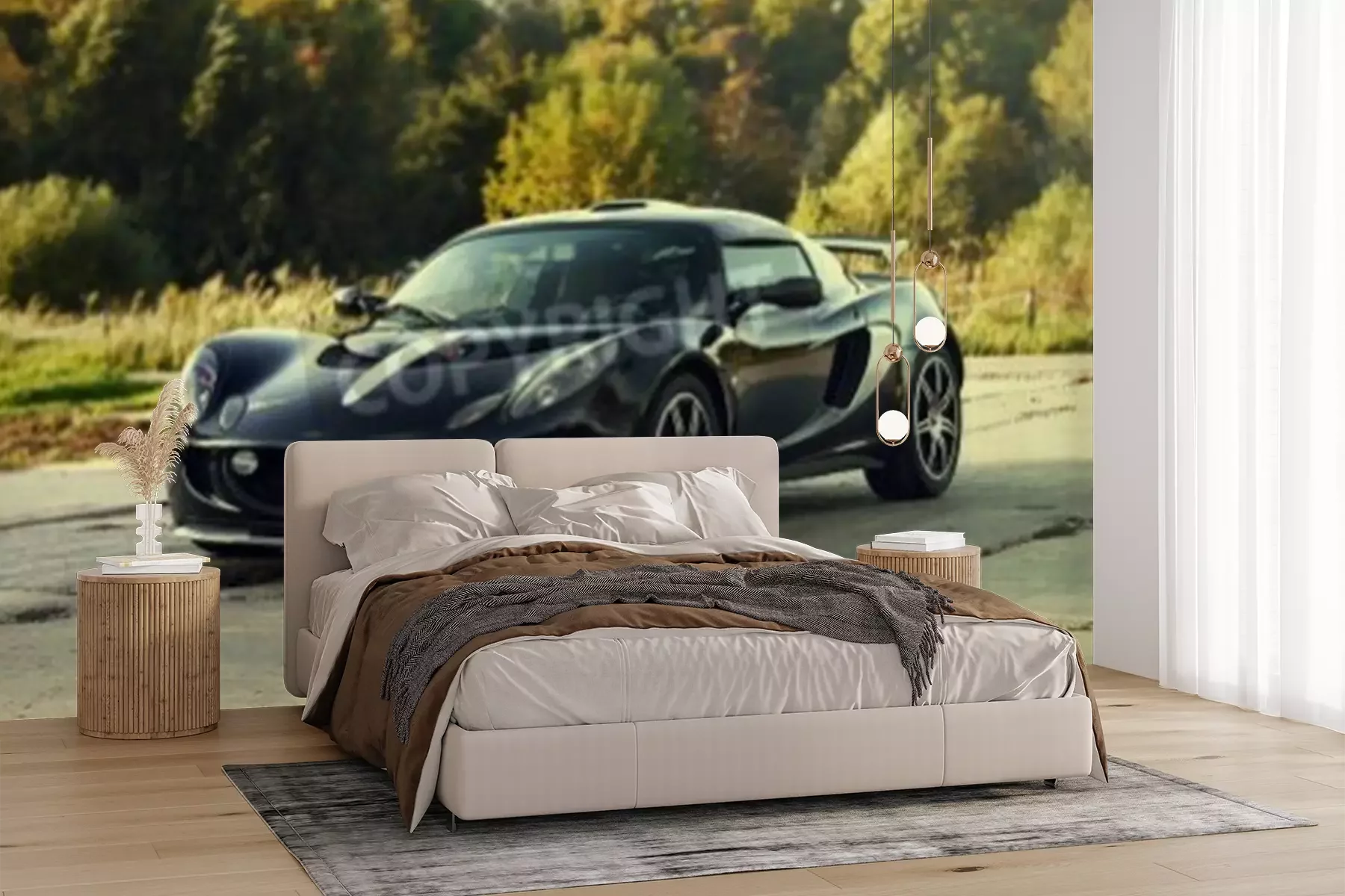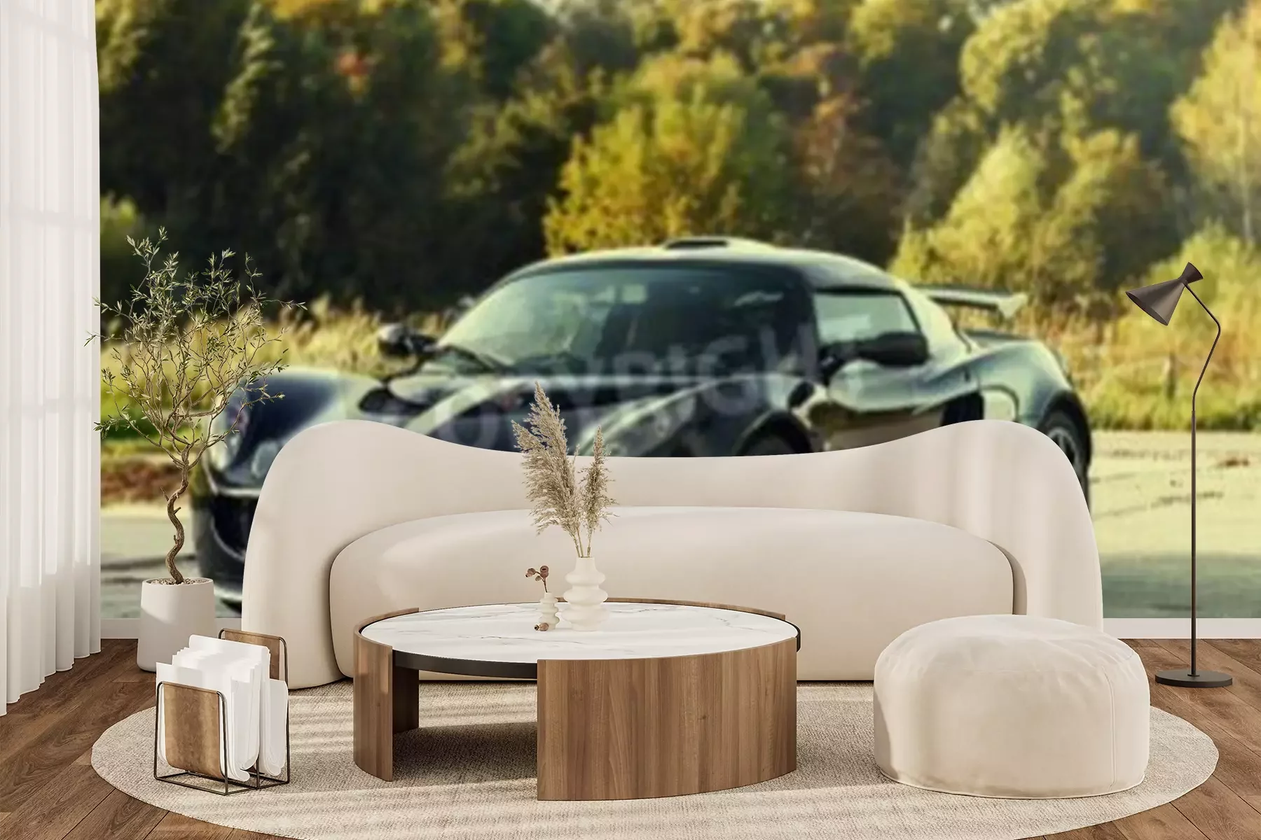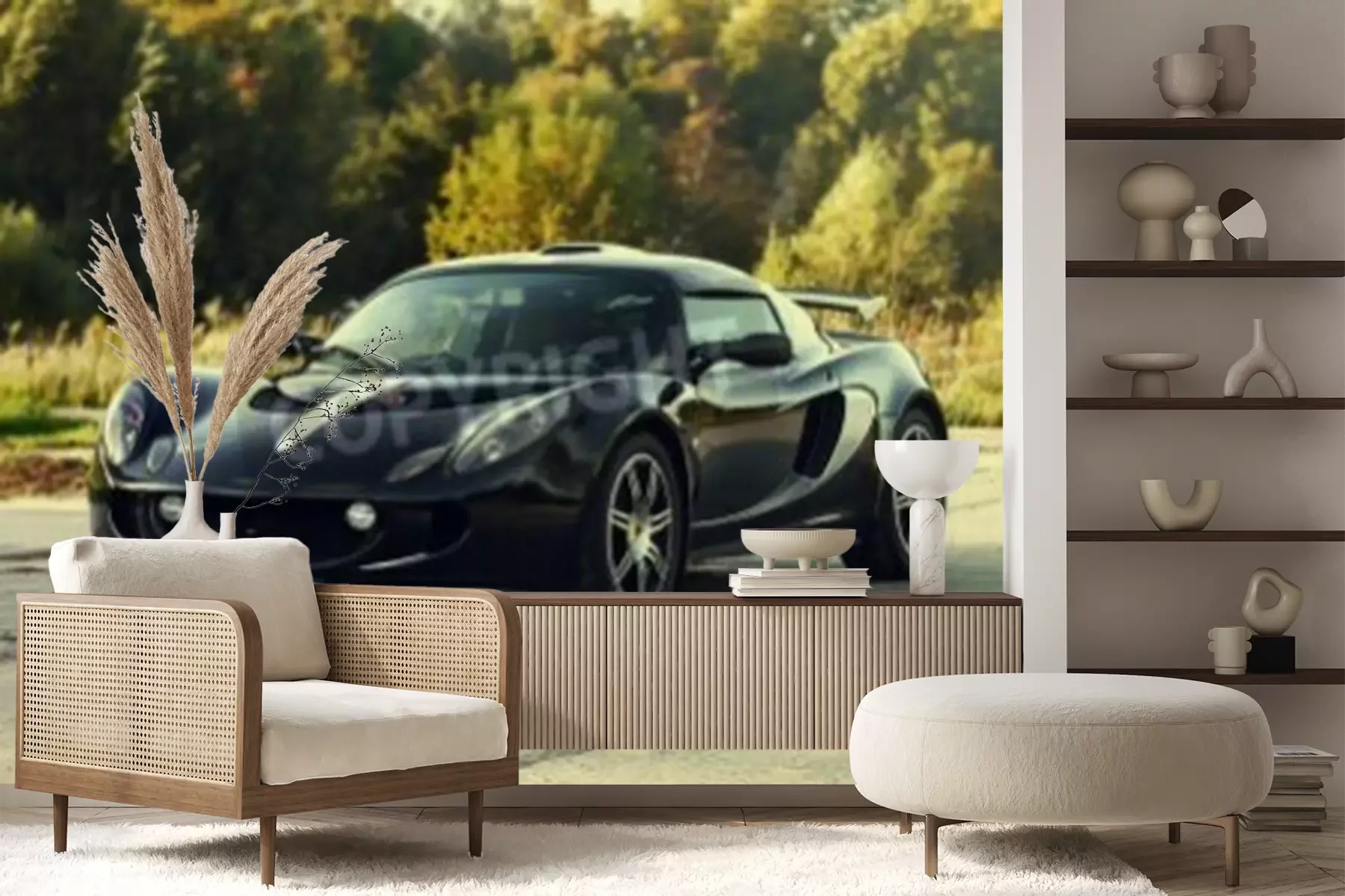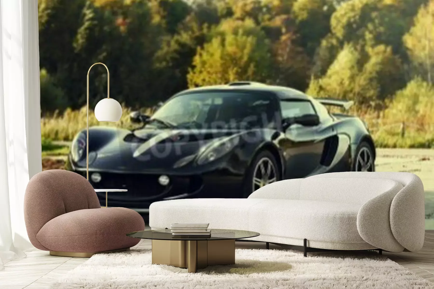 Fotobehang Black aggressive sport car on nature green background