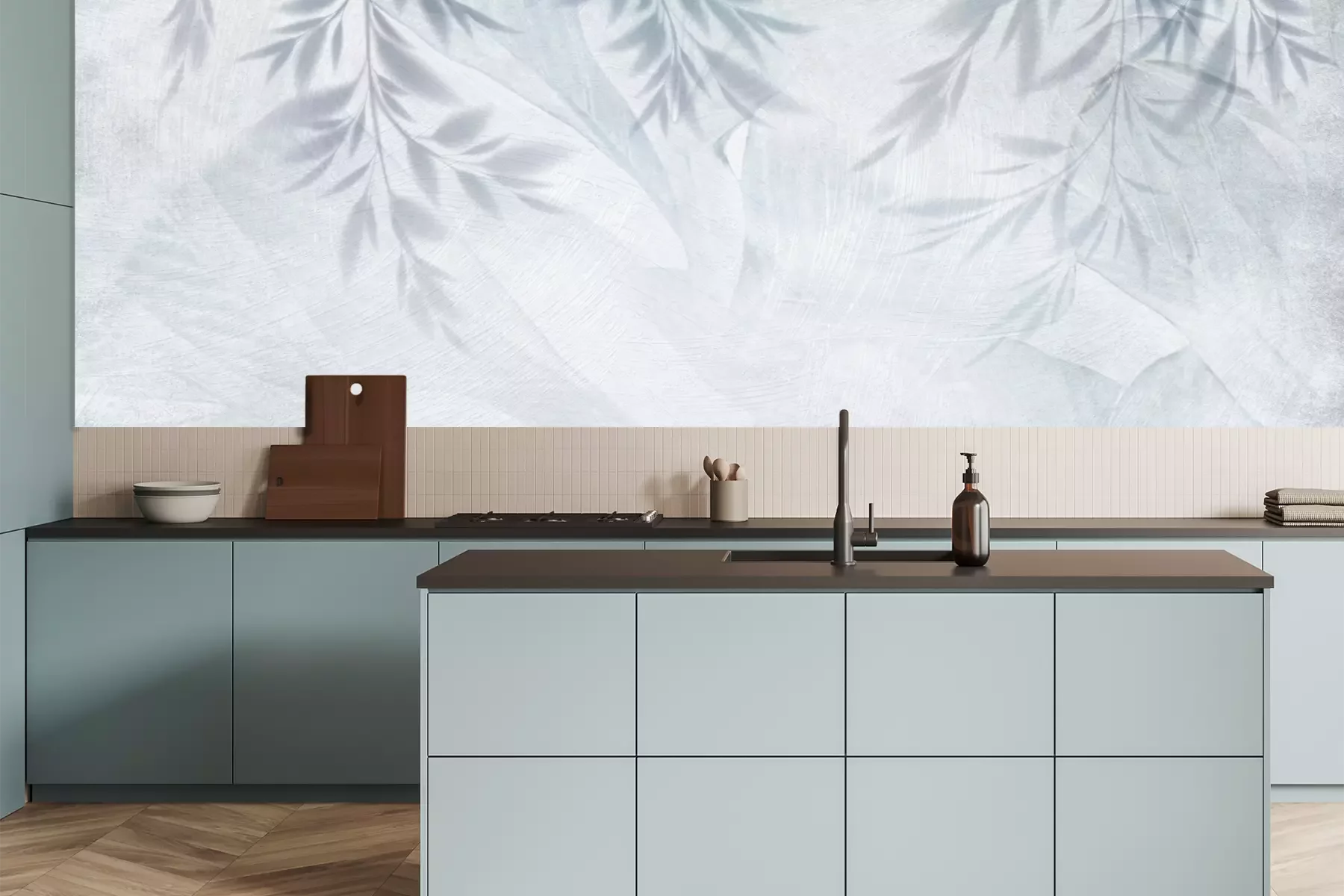 Het materiaal Premium is een glad vinyl op vlies, dat bestand is tegen uitrekken en vervorming. Het is dampdoorlatend – de muren kunnen vrij ademen – waardoor het geschikt is voor gebruik in de keuken en badkamer. Bij vervuiling kan het materiaal worden afgenomen met een vochtige doek. De maximale breedte van één baan bedraagt 95 of 105 cm, afhankelijk van de beschikbaarheid. Montage vindt plaats met de rand-aan-rand methode, wat een esthetisch resultaat zonder zichtbare naden oplevert. Omdat de lijm rechtstreeks op de muur wordt aangebracht, verloopt de installatie van het fotobehang snel en eenvoudig.