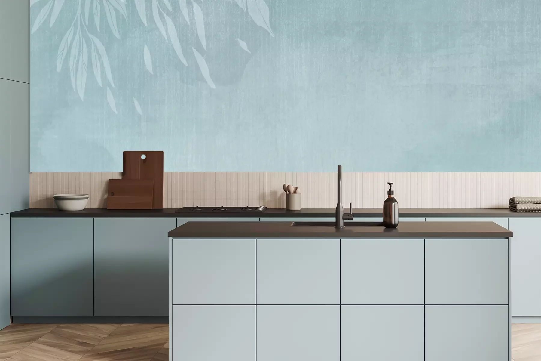 Het materiaal Premium is een glad vinyl op vlies, dat bestand is tegen uitrekken en vervorming. Het is dampdoorlatend – de muren kunnen vrij ademen – waardoor het geschikt is voor gebruik in de keuken en badkamer. Bij vervuiling kan het materiaal worden afgenomen met een vochtige doek. De maximale breedte van één baan bedraagt 95 of 105 cm, afhankelijk van de beschikbaarheid. Montage vindt plaats met de rand-aan-rand methode, wat een esthetisch resultaat zonder zichtbare naden oplevert. Omdat de lijm rechtstreeks op de muur wordt aangebracht, verloopt de installatie van het fotobehang snel en eenvoudig.