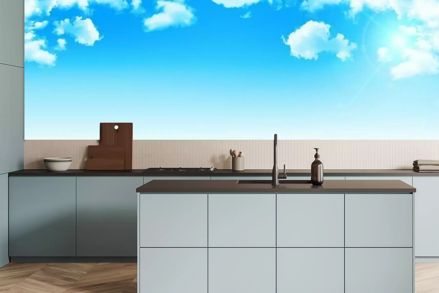 Het materiaal Premium is een glad vinyl op vlies, dat bestand is tegen uitrekken en vervorming. Het is dampdoorlatend – de muren kunnen vrij ademen – waardoor het geschikt is voor gebruik in de keuken en badkamer. Bij vervuiling kan het materiaal worden afgenomen met een vochtige doek. De maximale breedte van één baan bedraagt 95 of 105 cm, afhankelijk van de beschikbaarheid. Montage vindt plaats met de rand-aan-rand methode, wat een esthetisch resultaat zonder zichtbare naden oplevert. Omdat de lijm rechtstreeks op de muur wordt aangebracht, verloopt de installatie van het fotobehang snel en eenvoudig.