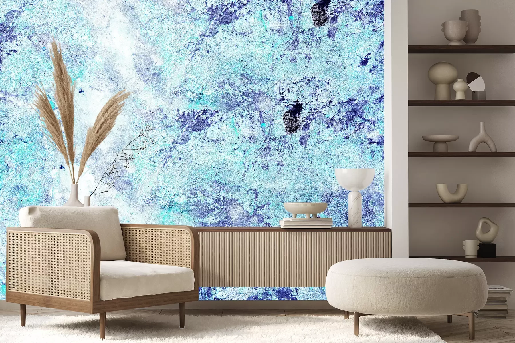 Het materiaal Premium+ is een gestructureerd vinyl op vlies met een gewicht van 255 g/m², dat kleine oneffenheden in de muur effectief camoufleert. De subtiele structuur van fijn zand geeft het oppervlak een exclusieve uitstraling, terwijl de halfmatte afwerking de diepte van de kleuren benadrukt. Het materiaal is dampdoorlatend, waardoor het ook in de keuken en badkamer kan worden gebruikt. De maximale breedte van één baan bedraagt 100 cm – bij grotere afmetingen wordt het fotobehang in meerdere gelijke banen verdeeld. De lijm wordt direct op de muur aangebracht en het behang wordt rand-aan-rand geplakt, wat zorgt voor een esthetisch resultaat zonder zichtbare naden. Het oppervlak kan gemakkelijk worden schoongemaakt door het voorzichtig af te nemen met een vochtige doek.