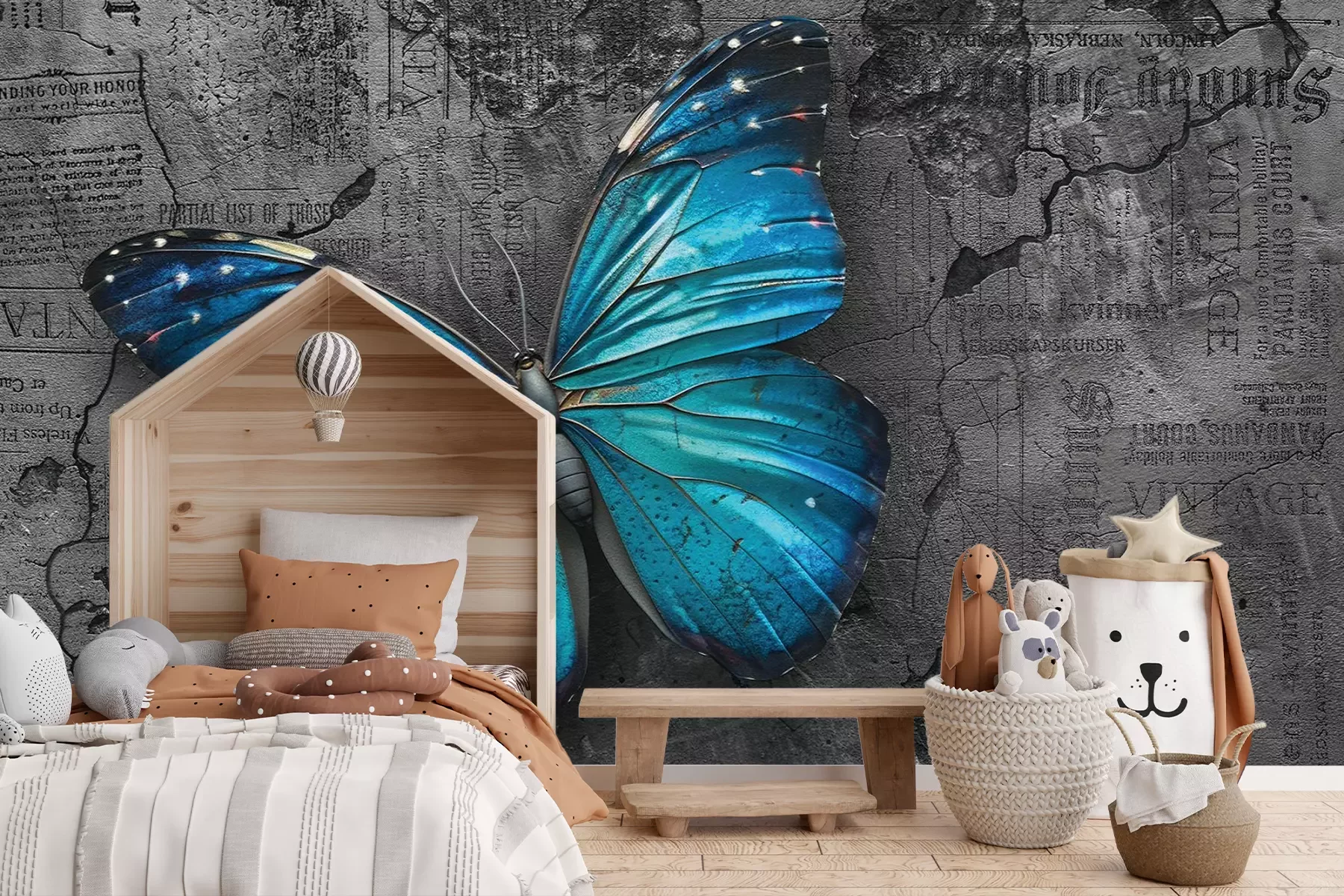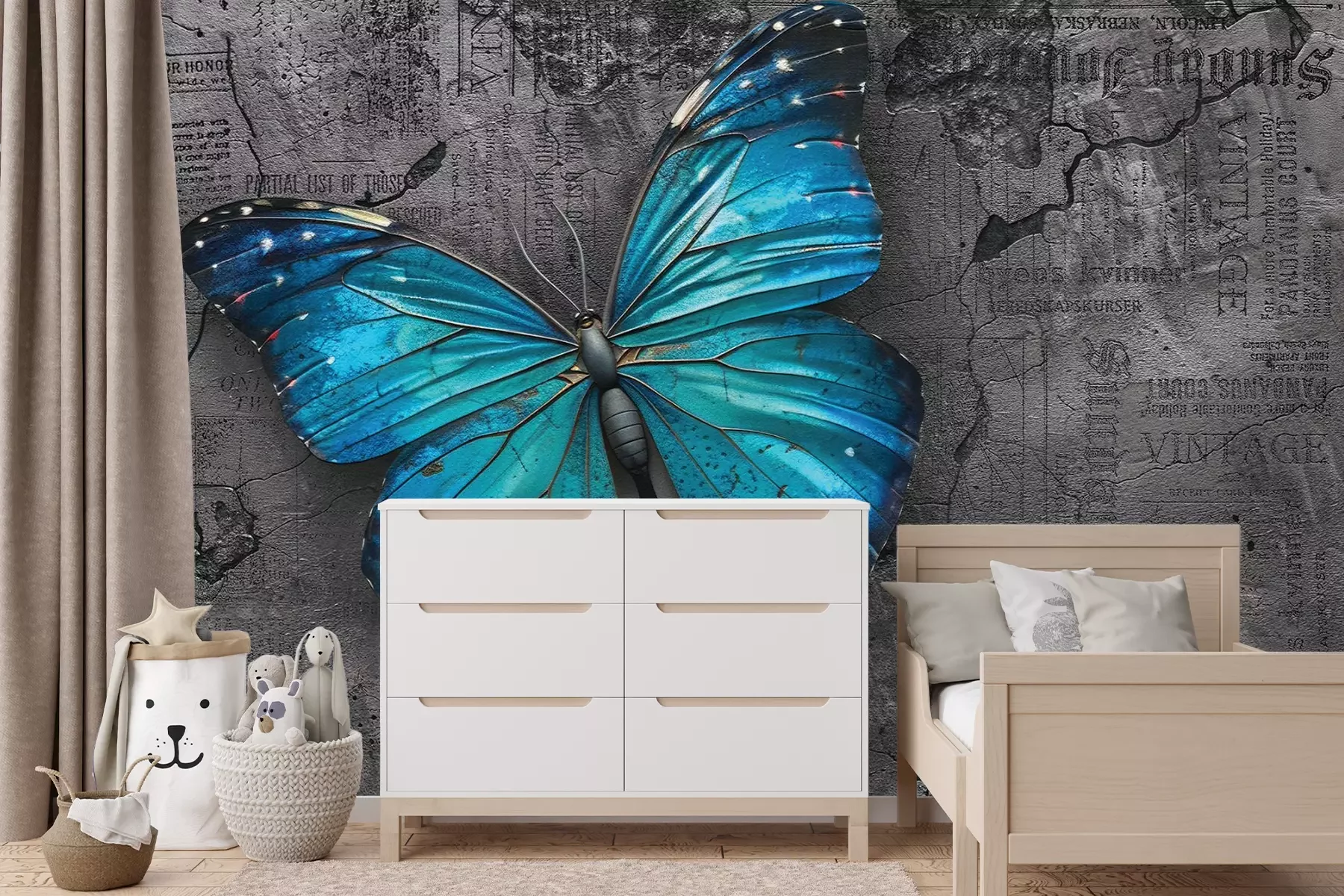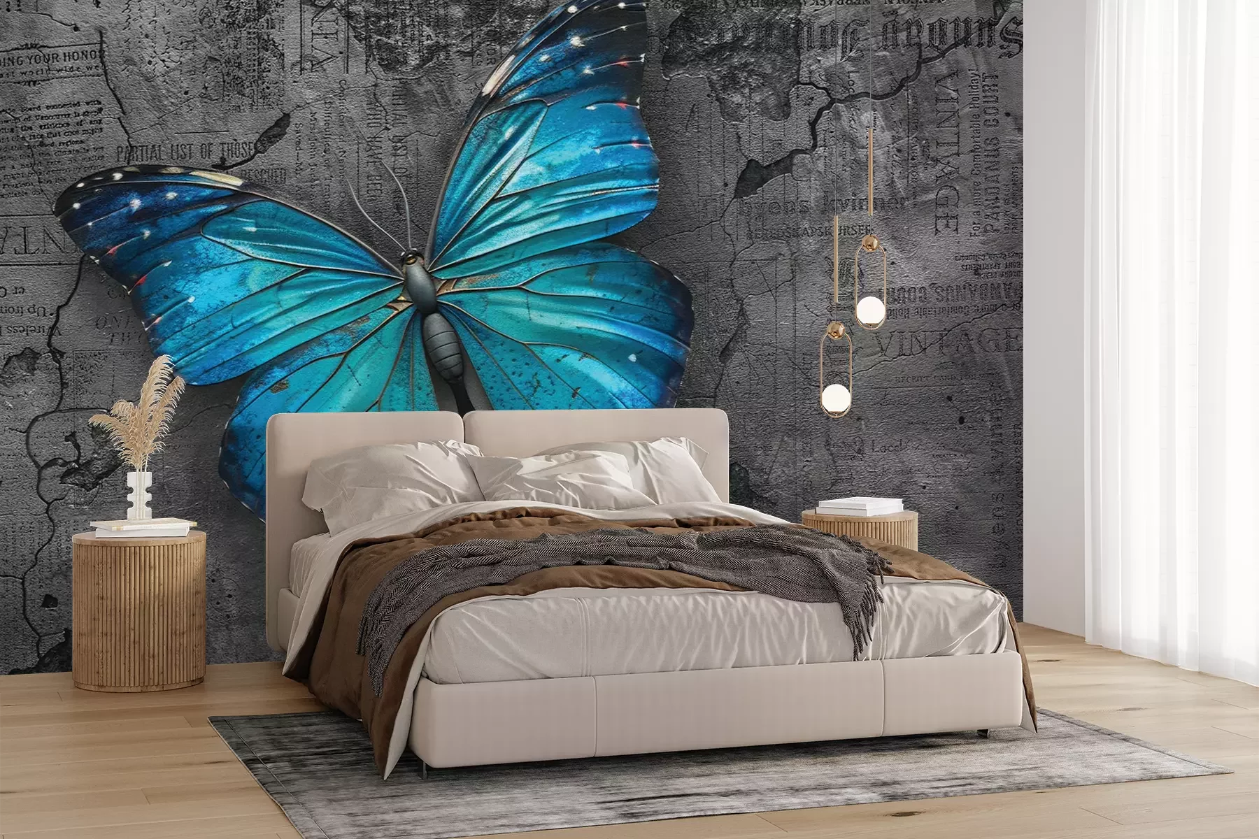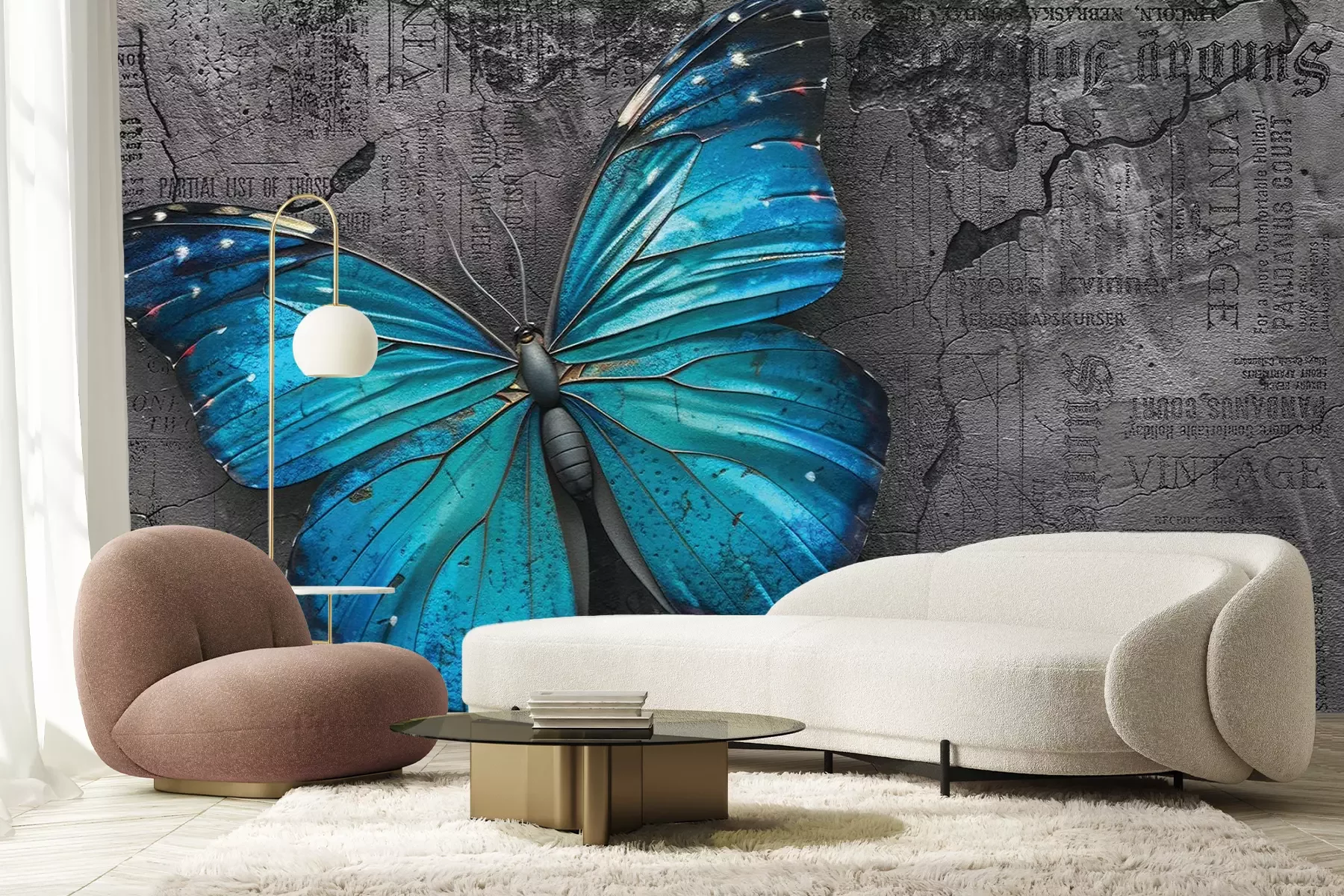 Blauwe 3d-vlinder op een modern patroon met een grijze betonnen textuur als achtergrond