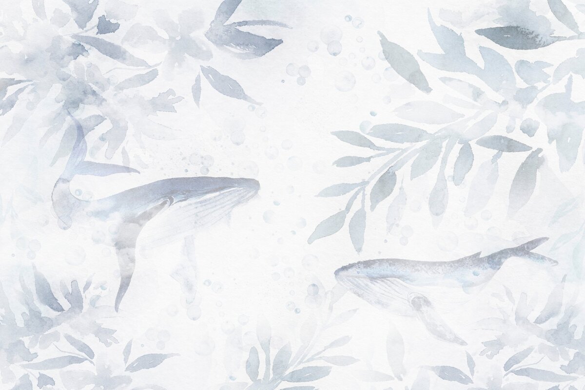 Fotobehang: Blauwe bladeren en walvissen in een delicate aquarelstijl