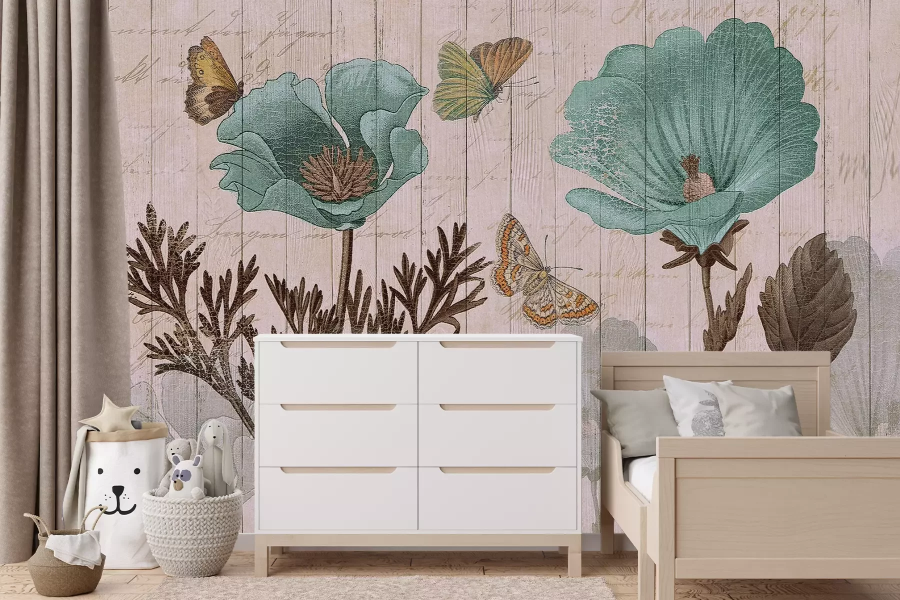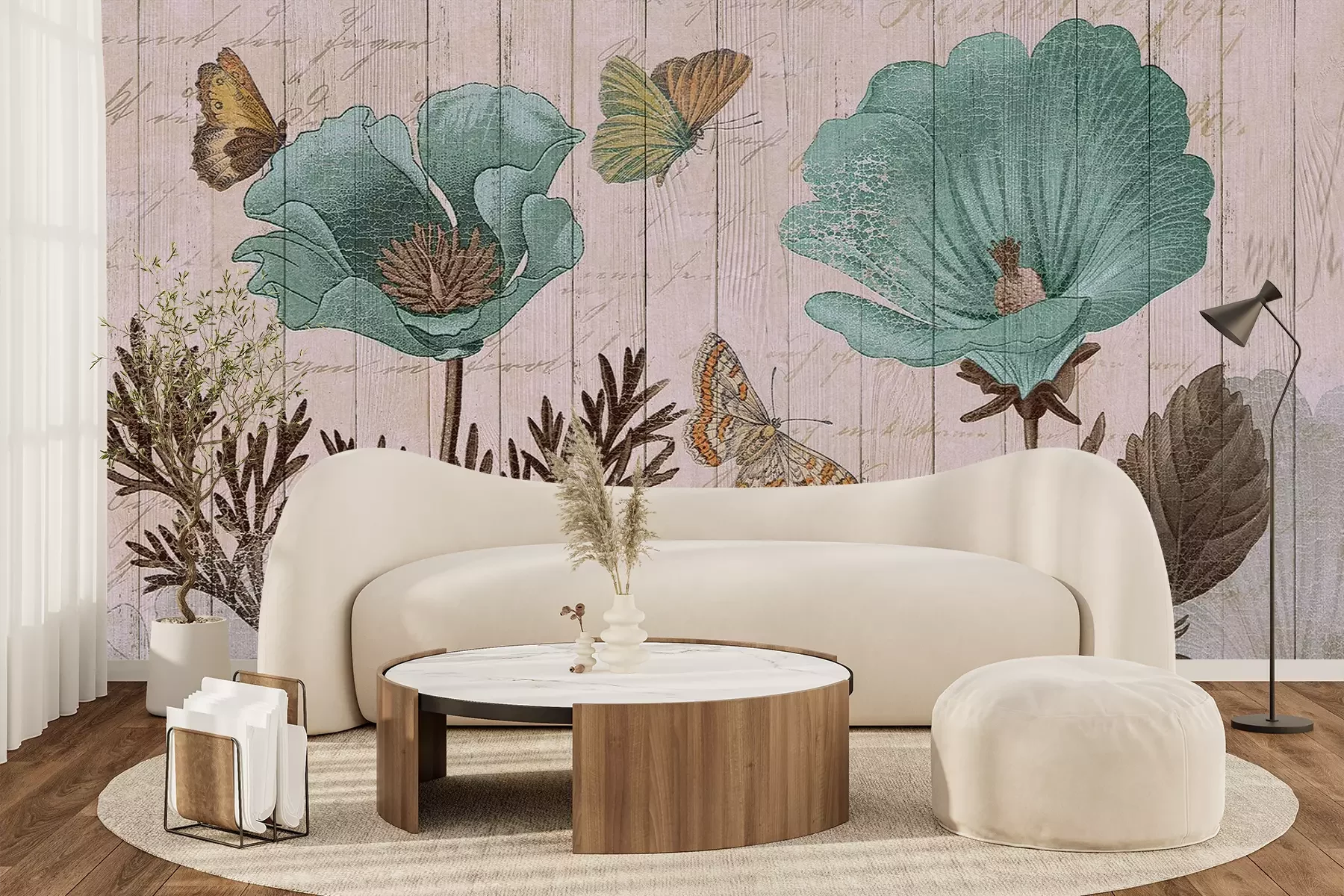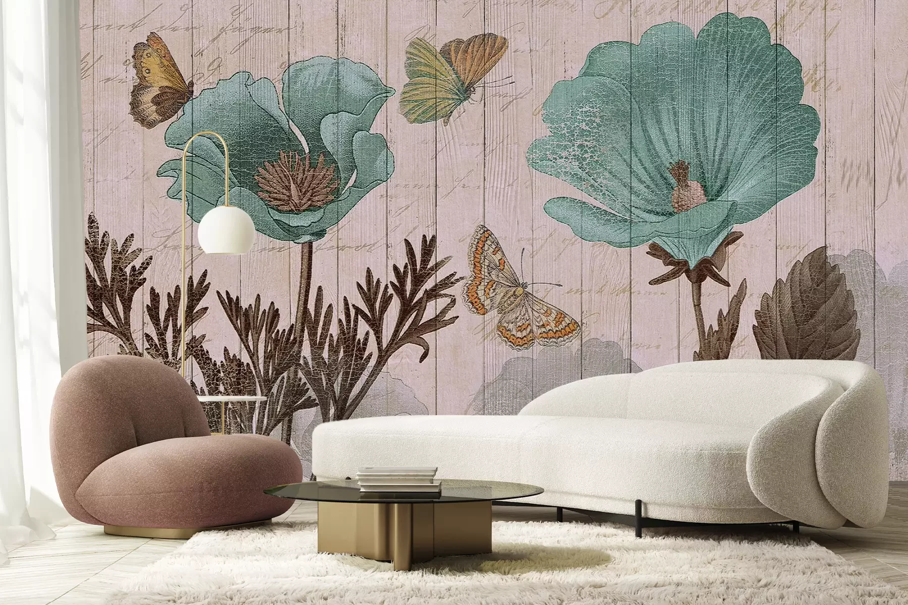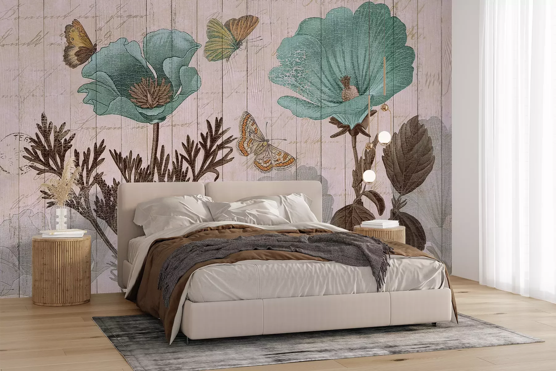 Blauwe bloemen en vlinders op een houten achtergrond, botanisch retromotief