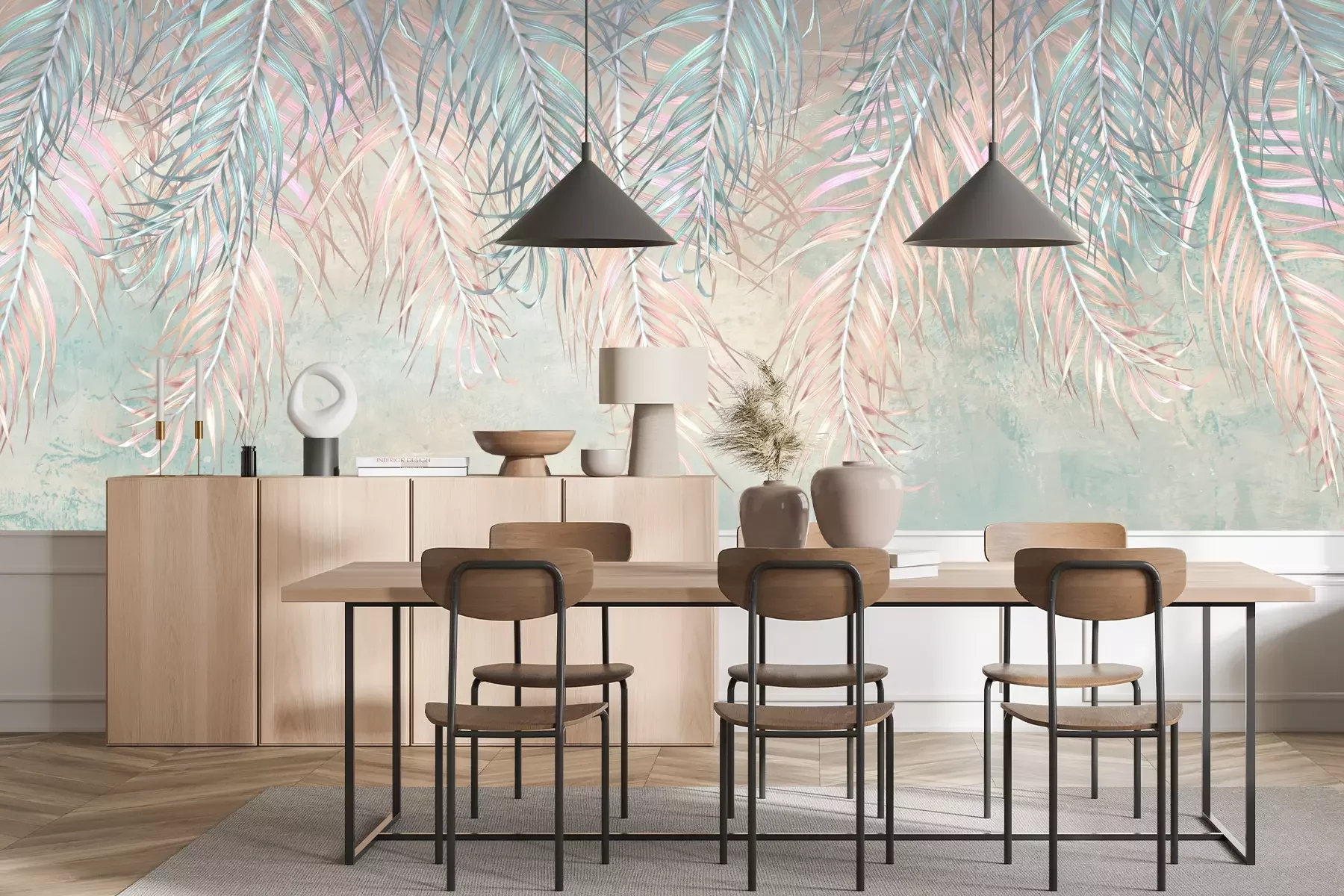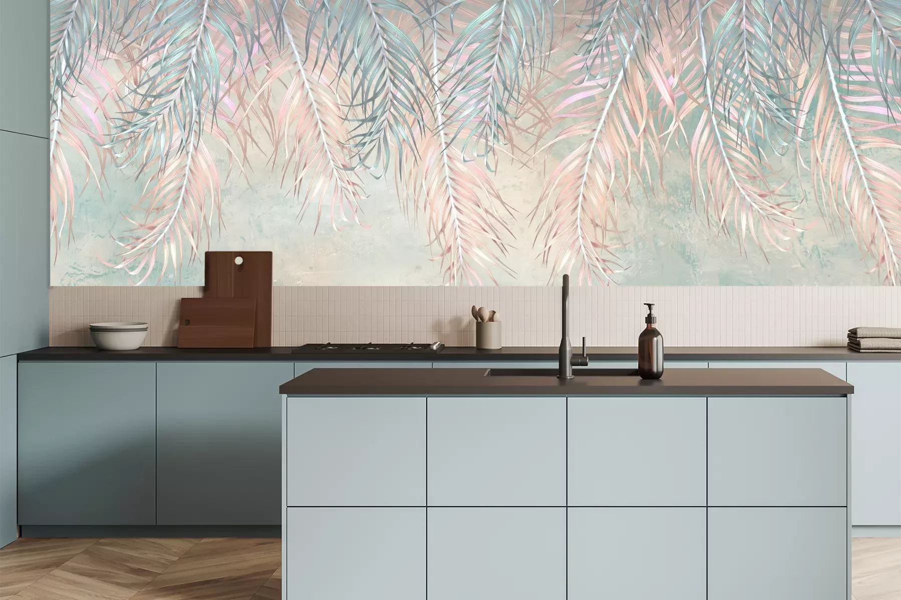 Het materiaal Premium+ is een gestructureerd vinyl op vlies met een gewicht van 255 g/m², dat kleine oneffenheden in de muur effectief camoufleert. De subtiele structuur van fijn zand geeft het oppervlak een exclusieve uitstraling, terwijl de halfmatte afwerking de diepte van de kleuren benadrukt. Het materiaal is dampdoorlatend, waardoor het ook in de keuken en badkamer kan worden gebruikt. De maximale breedte van één baan bedraagt 100 cm – bij grotere afmetingen wordt het fotobehang in meerdere gelijke banen verdeeld. De lijm wordt direct op de muur aangebracht en het behang wordt rand-aan-rand geplakt, wat zorgt voor een esthetisch resultaat zonder zichtbare naden. Het oppervlak kan gemakkelijk worden schoongemaakt door het voorzichtig af te nemen met een vochtige doek.