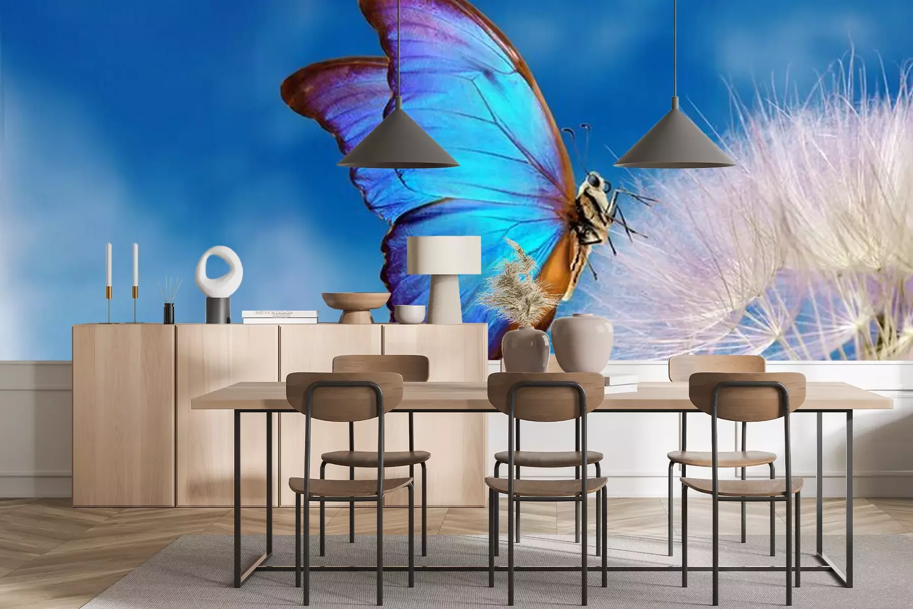 Fotobehang Blauwe morpho vlinder op een paardenbloem