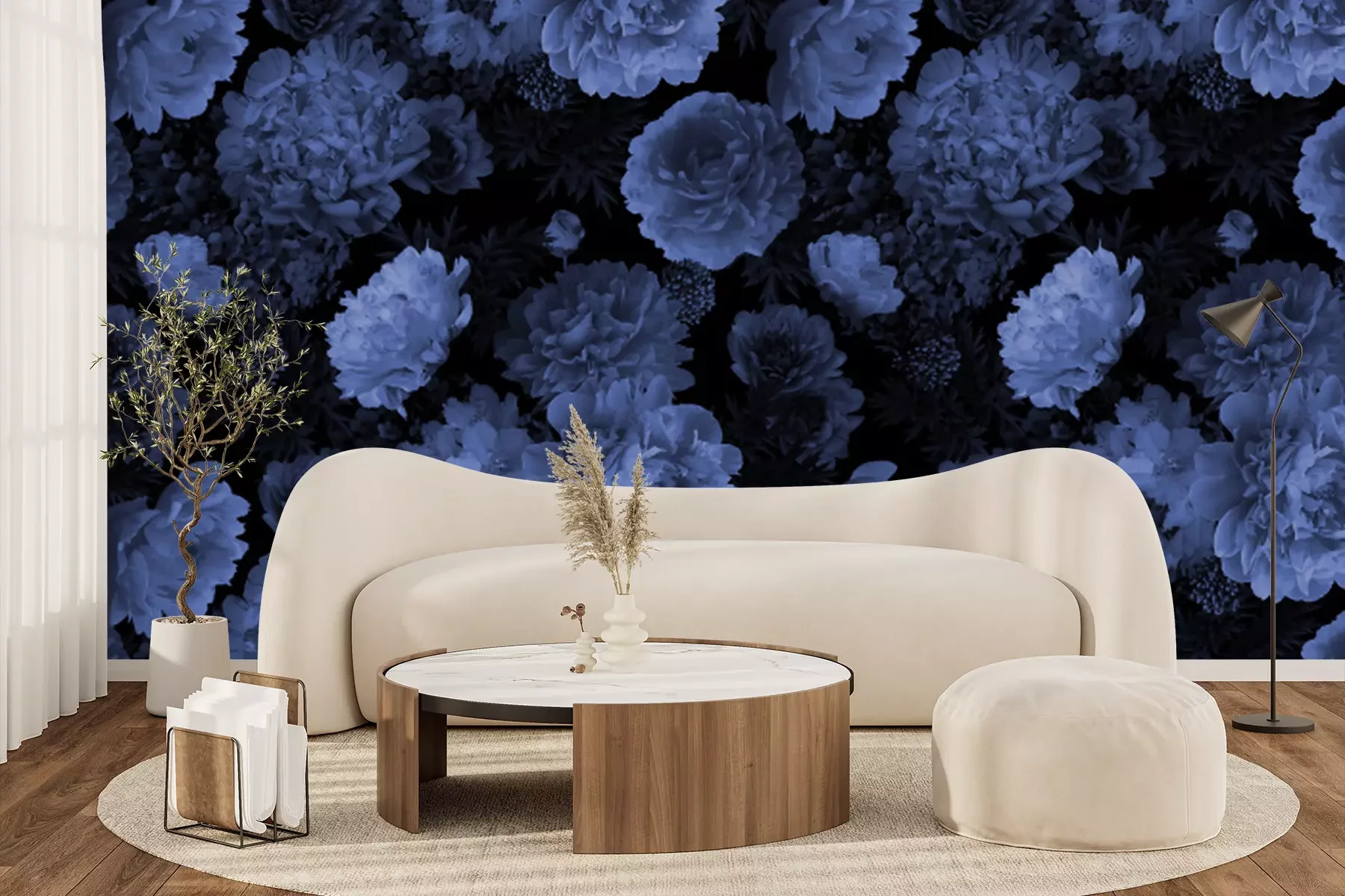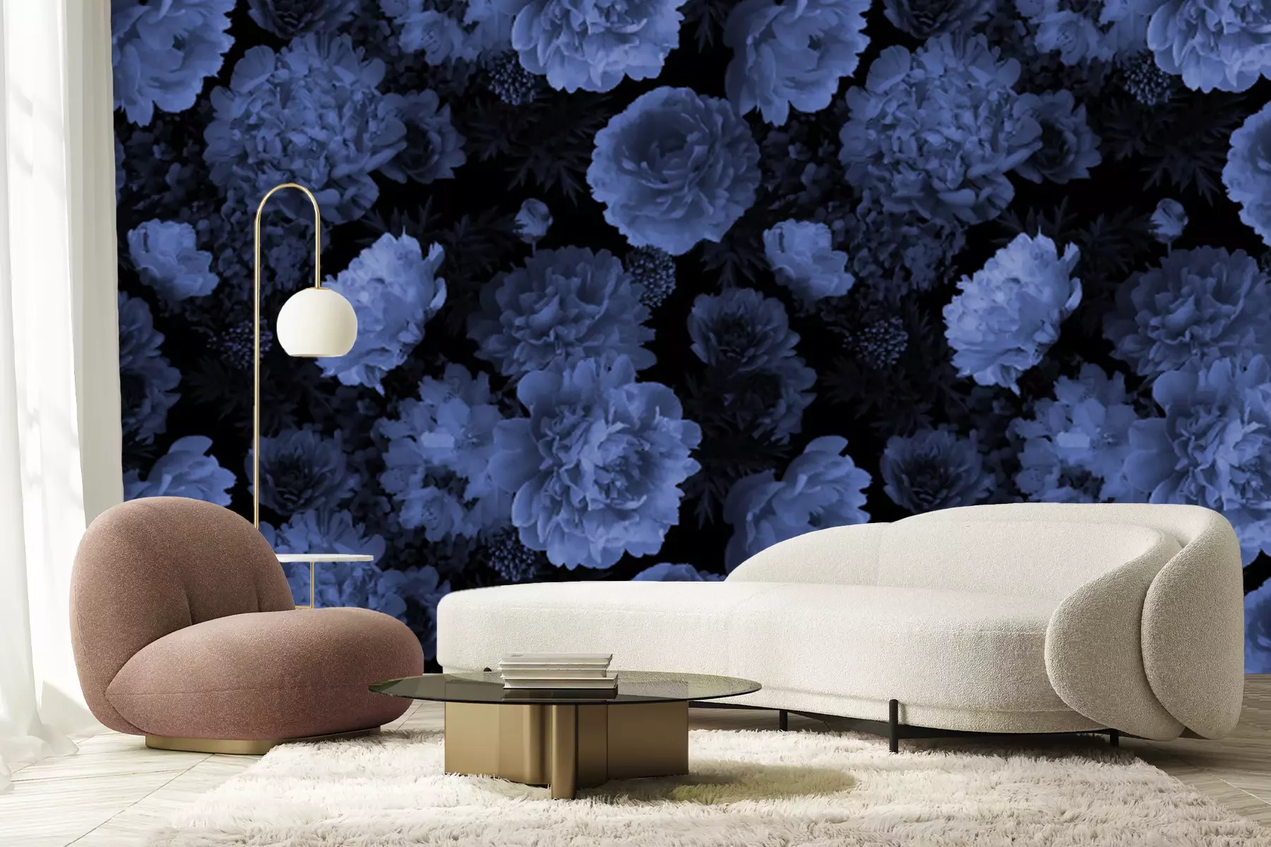 Fotobehang Blauwe pioenroos bloemen op een zwarte achtergrond