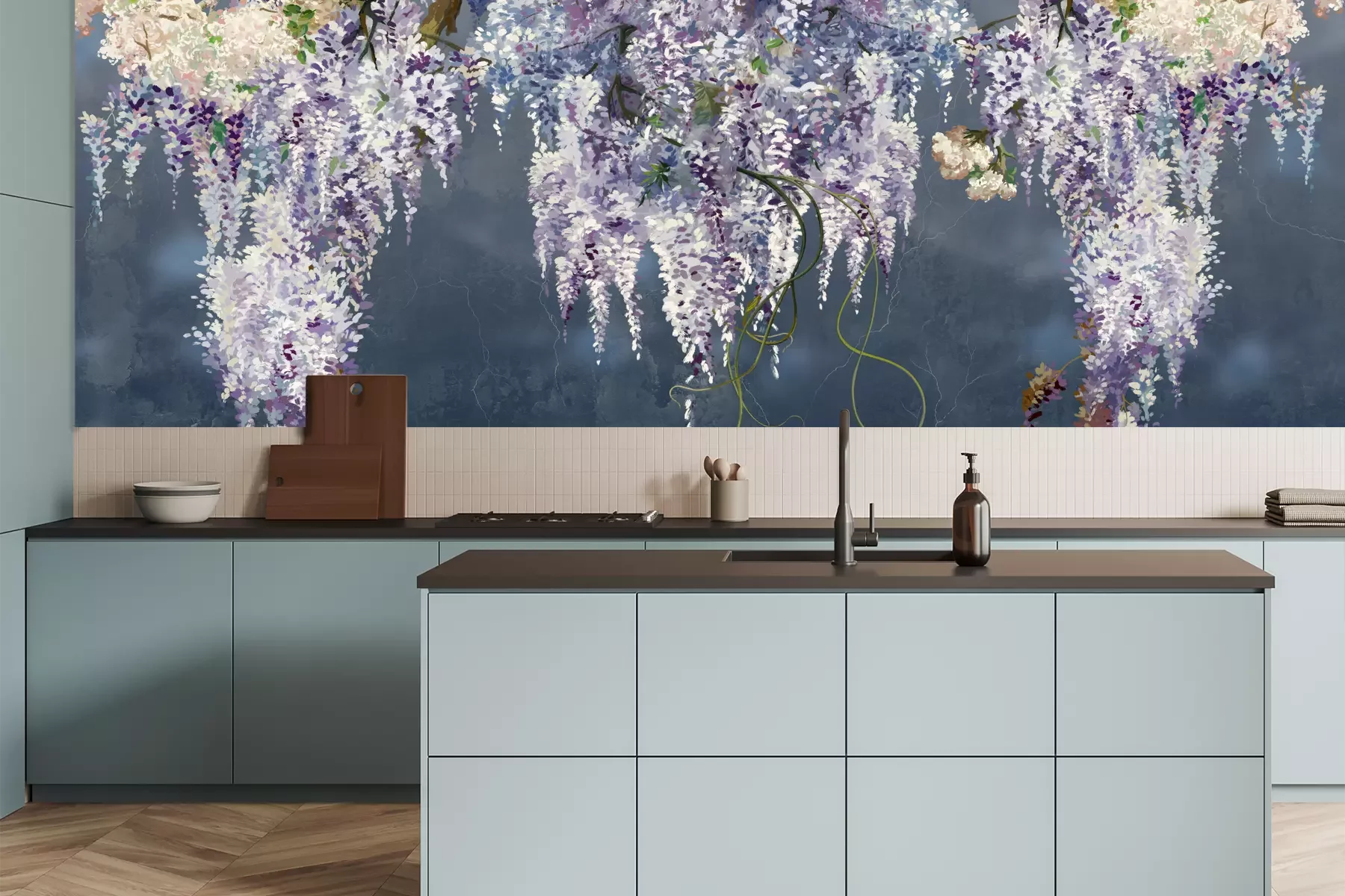 Het materiaal Premium is een glad vinyl op vlies, dat bestand is tegen uitrekken en vervorming. Het is dampdoorlatend – de muren kunnen vrij ademen – waardoor het geschikt is voor gebruik in de keuken en badkamer. Bij vervuiling kan het materiaal worden afgenomen met een vochtige doek. De maximale breedte van één baan bedraagt 95 of 105 cm, afhankelijk van de beschikbaarheid. Montage vindt plaats met de rand-aan-rand methode, wat een esthetisch resultaat zonder zichtbare naden oplevert. Omdat de lijm rechtstreeks op de muur wordt aangebracht, verloopt de installatie van het fotobehang snel en eenvoudig.
