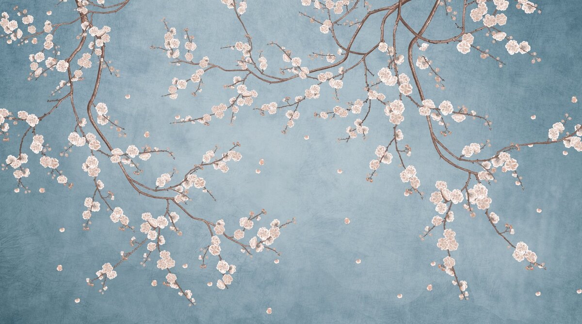 Fotobehang: Bloeiende boomtakken op een blauwe achtergrond
