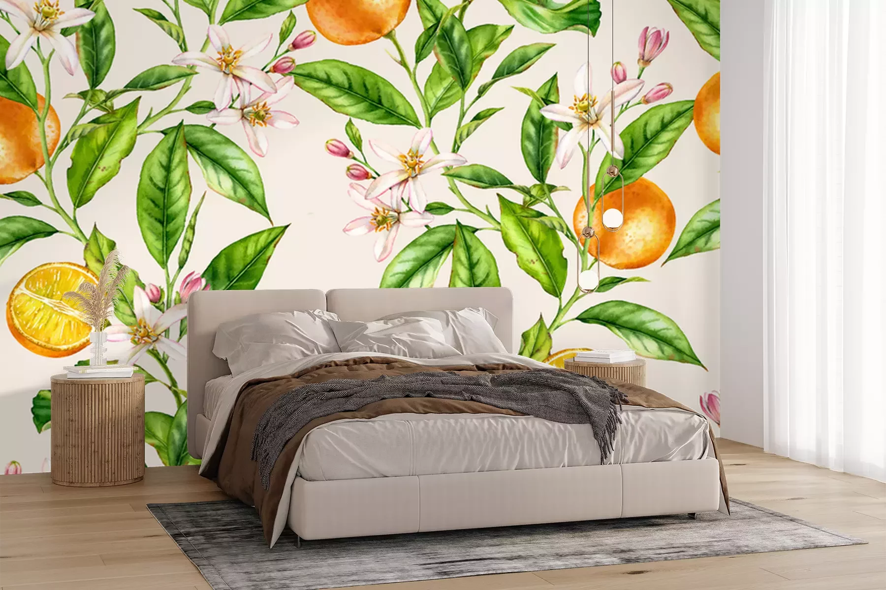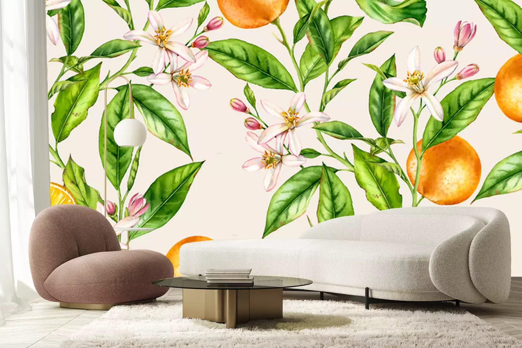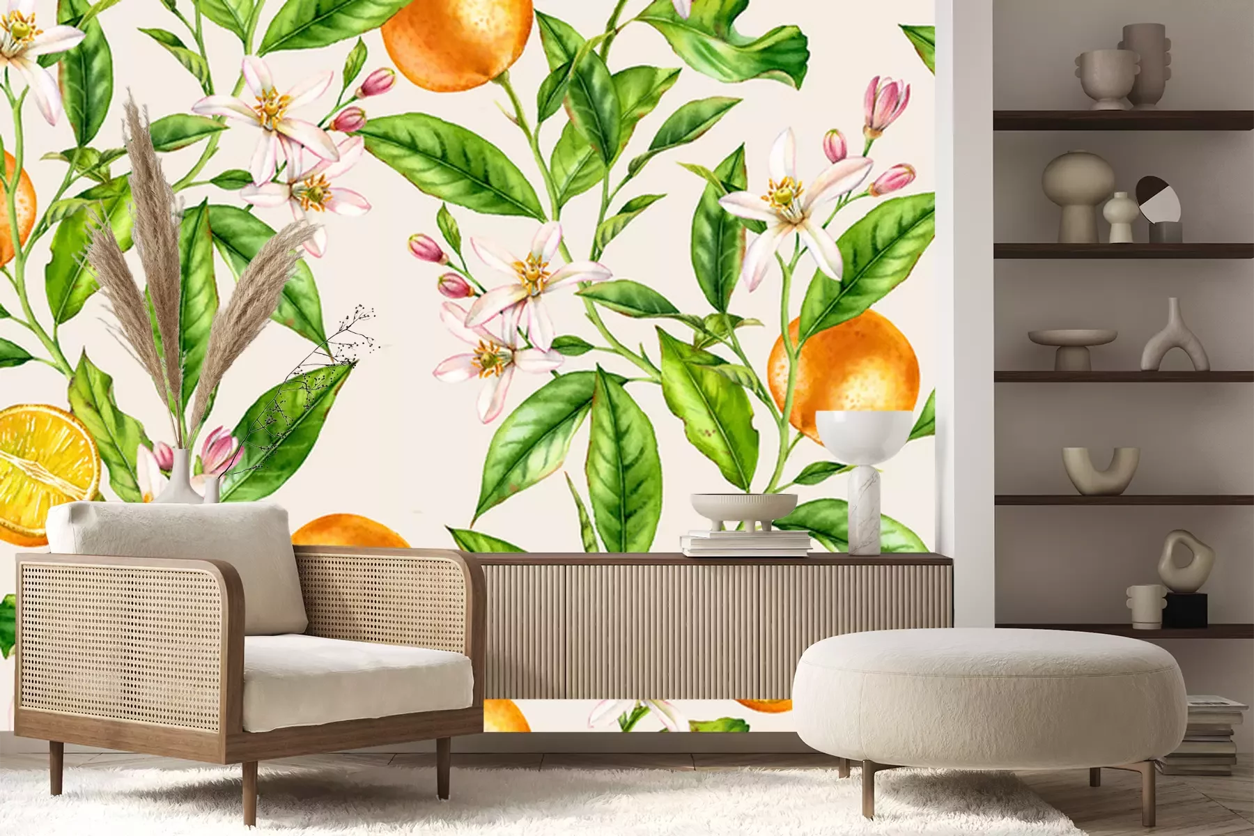 Fotobehang Bloeiende en vruchtdragende sinaasappel
