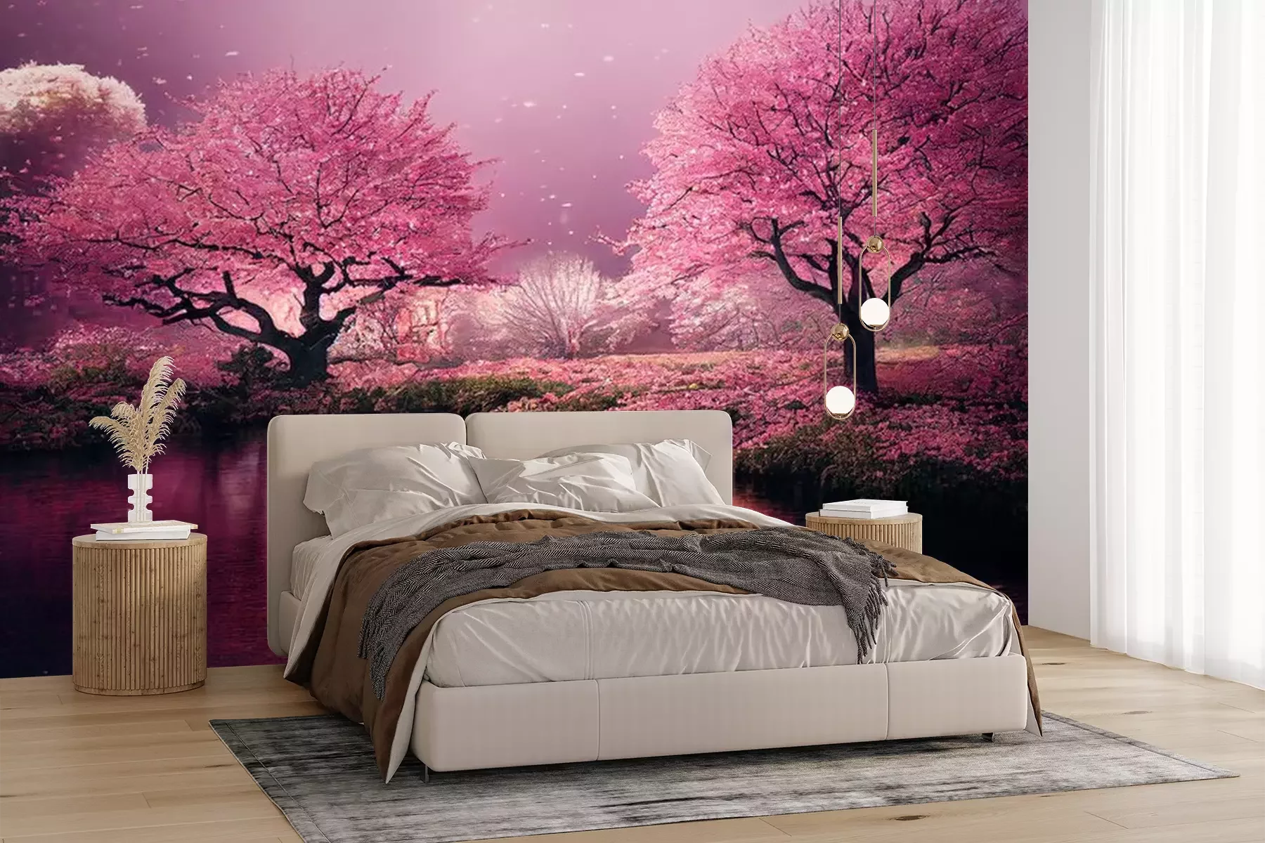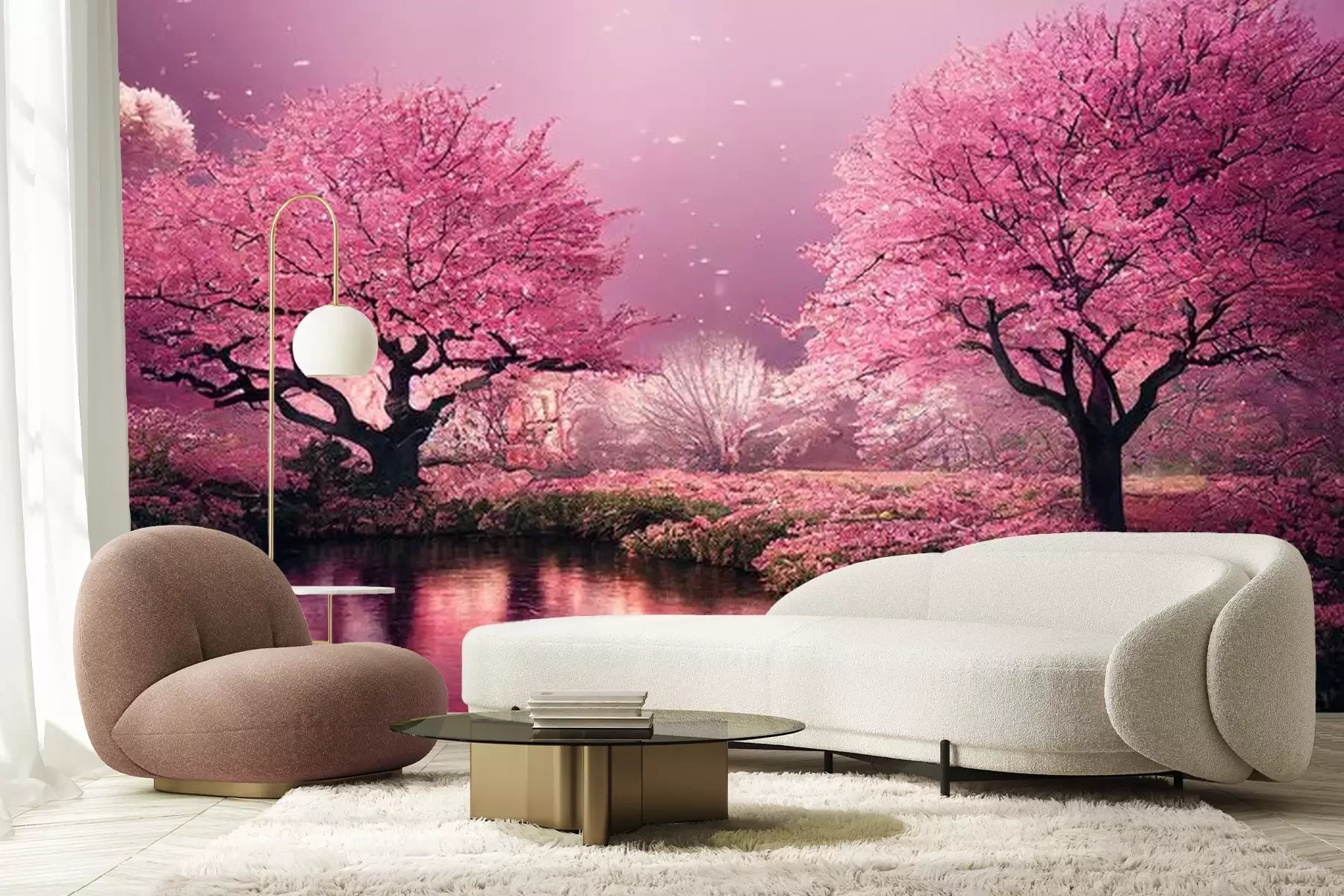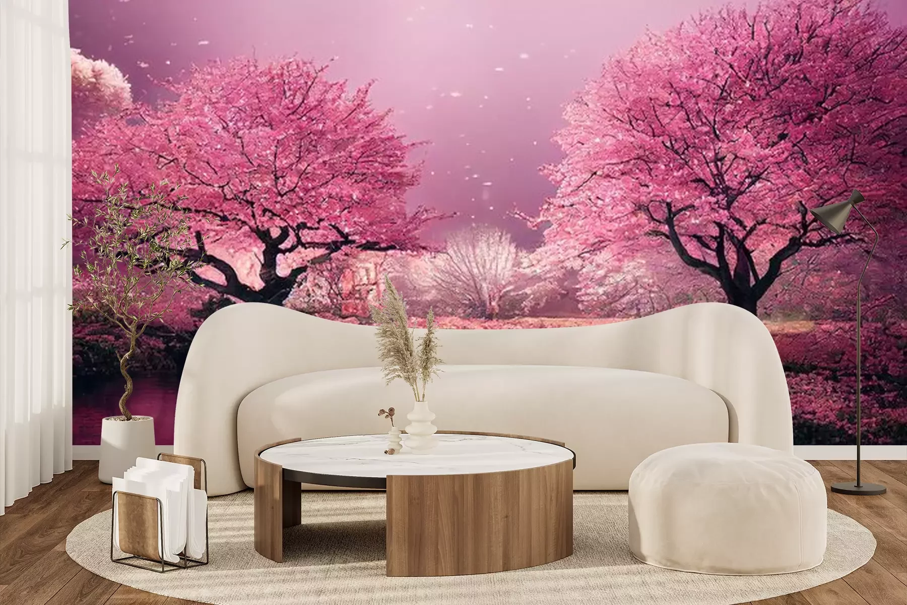 Fotobehang Bloeiende kersenbomen in een roze tuin