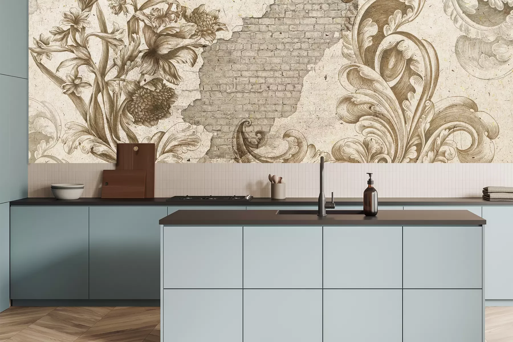 Het materiaal Premium is een glad vinyl op vlies, dat bestand is tegen uitrekken en vervorming. Het is dampdoorlatend – de muren kunnen vrij ademen – waardoor het geschikt is voor gebruik in de keuken en badkamer. Bij vervuiling kan het materiaal worden afgenomen met een vochtige doek. De maximale breedte van één baan bedraagt 95 of 105 cm, afhankelijk van de beschikbaarheid. Montage vindt plaats met de rand-aan-rand methode, wat een esthetisch resultaat zonder zichtbare naden oplevert. Omdat de lijm rechtstreeks op de muur wordt aangebracht, verloopt de installatie van het fotobehang snel en eenvoudig.