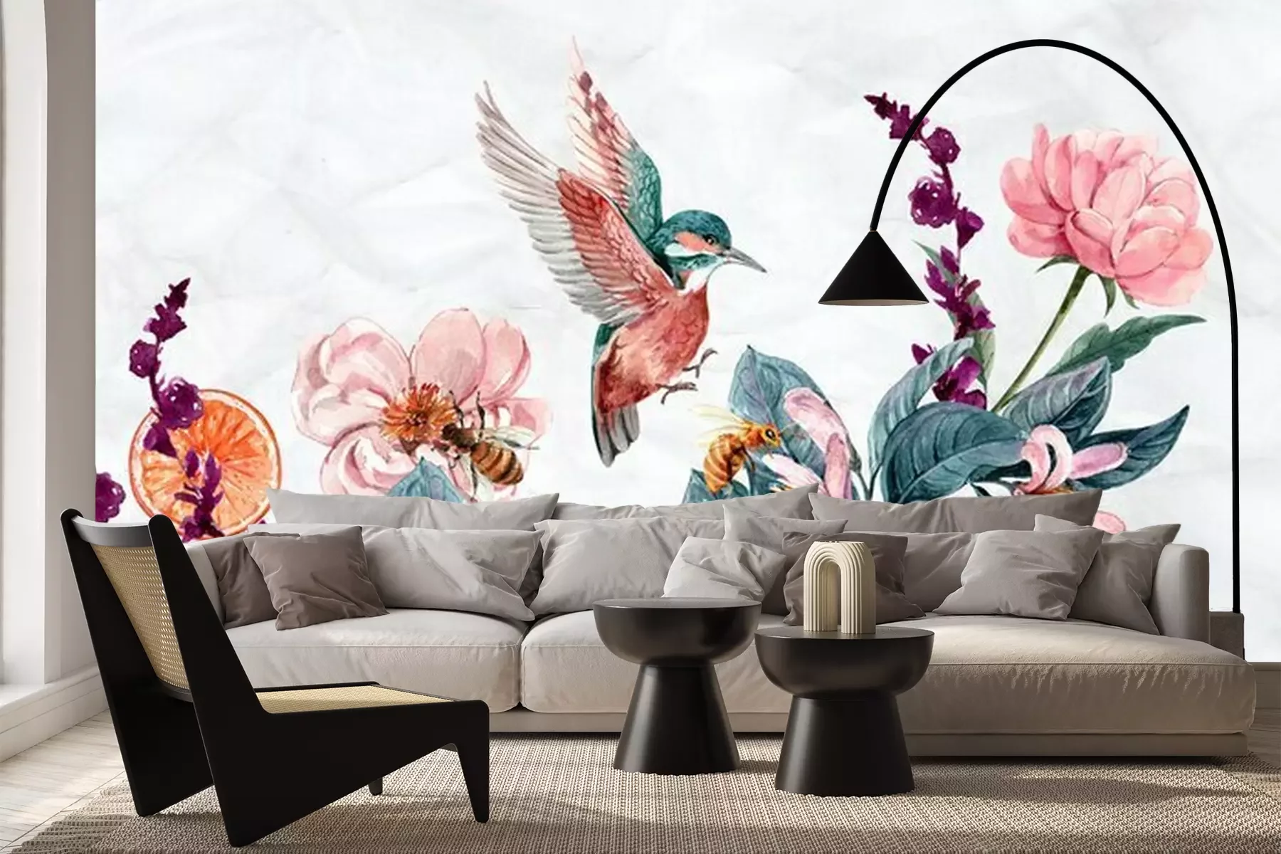 Het materiaal Premium+ is een gestructureerd vinyl op vlies met een gewicht van 255 g/m², dat kleine oneffenheden in de muur effectief camoufleert. De subtiele structuur van fijn zand geeft het oppervlak een exclusieve uitstraling, terwijl de halfmatte afwerking de diepte van de kleuren benadrukt. Het materiaal is dampdoorlatend, waardoor het ook in de keuken en badkamer kan worden gebruikt. De maximale breedte van één baan bedraagt 100 cm – bij grotere afmetingen wordt het fotobehang in meerdere gelijke banen verdeeld. De lijm wordt direct op de muur aangebracht en het behang wordt rand-aan-rand geplakt, wat zorgt voor een esthetisch resultaat zonder zichtbare naden. Het oppervlak kan gemakkelijk worden schoongemaakt door het voorzichtig af te nemen met een vochtige doek.