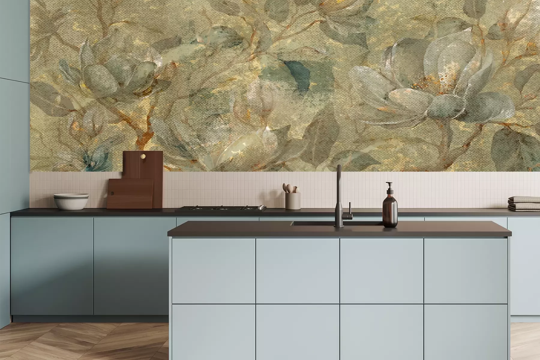 Het materiaal Premium is een glad vinyl op vlies, dat bestand is tegen uitrekken en vervorming. Het is dampdoorlatend – de muren kunnen vrij ademen – waardoor het geschikt is voor gebruik in de keuken en badkamer. Bij vervuiling kan het materiaal worden afgenomen met een vochtige doek. De maximale breedte van één baan bedraagt 95 of 105 cm, afhankelijk van de beschikbaarheid. Montage vindt plaats met de rand-aan-rand methode, wat een esthetisch resultaat zonder zichtbare naden oplevert. Omdat de lijm rechtstreeks op de muur wordt aangebracht, verloopt de installatie van het fotobehang snel en eenvoudig.