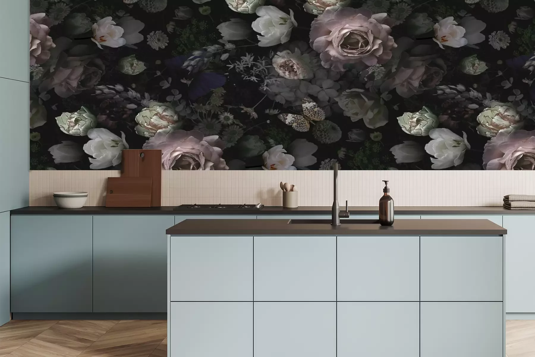 Het materiaal Premium is een glad vinyl op vlies, dat bestand is tegen uitrekken en vervorming. Het is dampdoorlatend – de muren kunnen vrij ademen – waardoor het geschikt is voor gebruik in de keuken en badkamer. Bij vervuiling kan het materiaal worden afgenomen met een vochtige doek. De maximale breedte van één baan bedraagt 95 of 105 cm, afhankelijk van de beschikbaarheid. Montage vindt plaats met de rand-aan-rand methode, wat een esthetisch resultaat zonder zichtbare naden oplevert. Omdat de lijm rechtstreeks op de muur wordt aangebracht, verloopt de installatie van het fotobehang snel en eenvoudig.