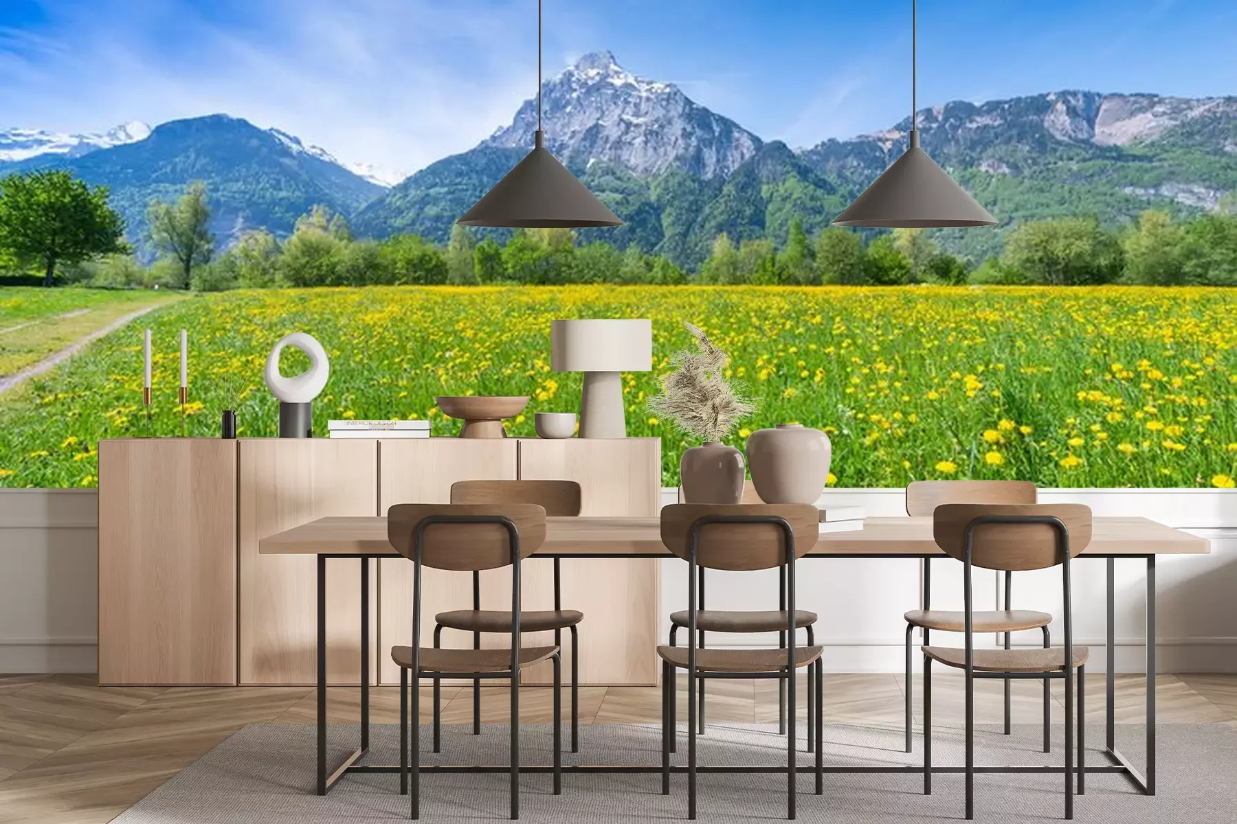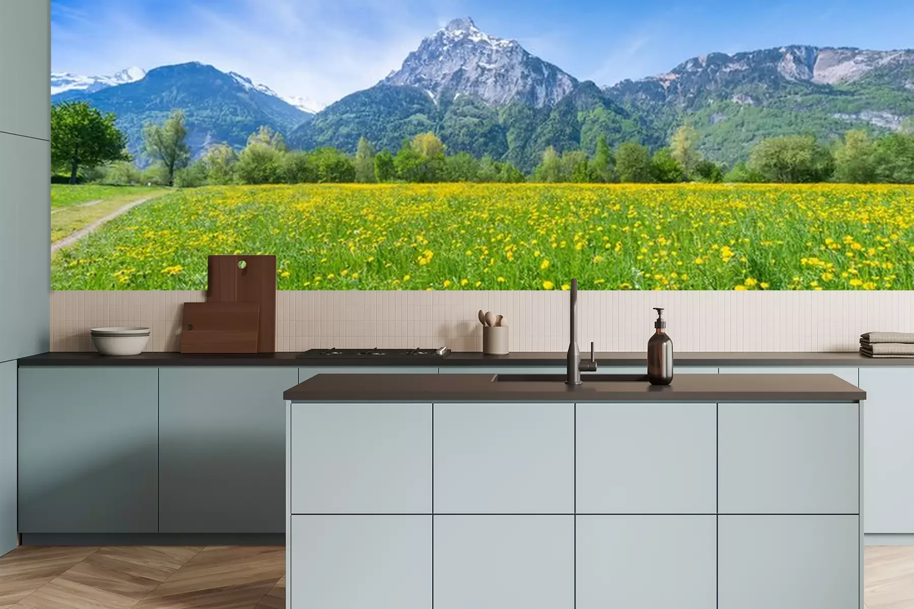 Fotobehang Bloemenweide met een bergachtergrond