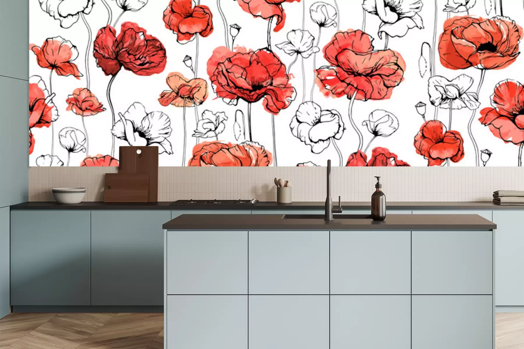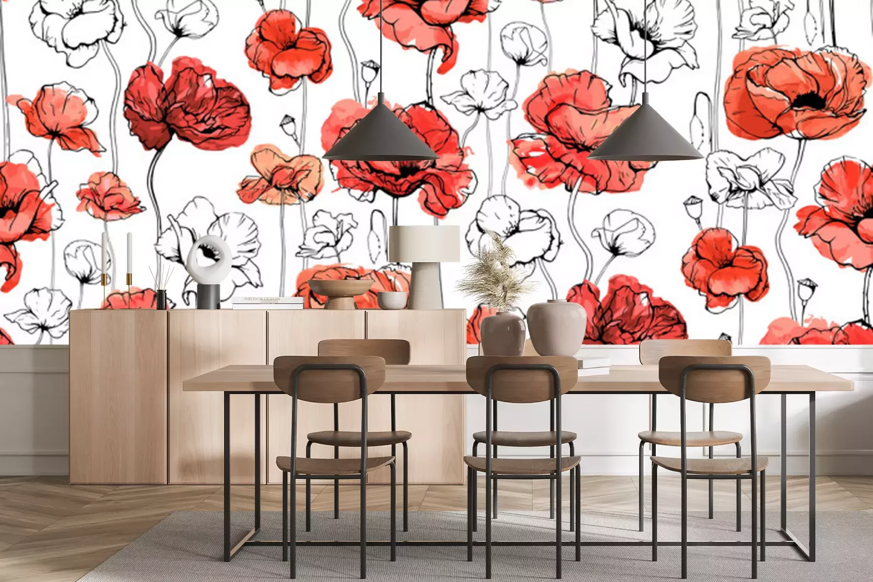 Fotobehang Bloemmotief met rode bloemen en knoppen