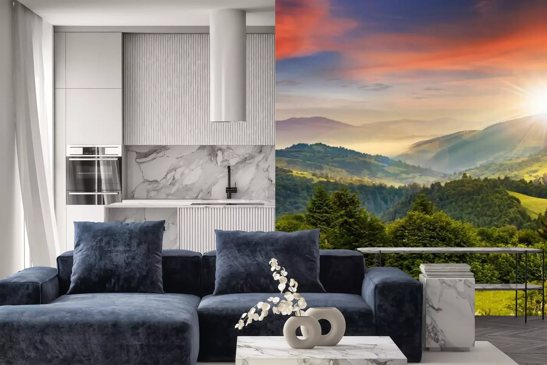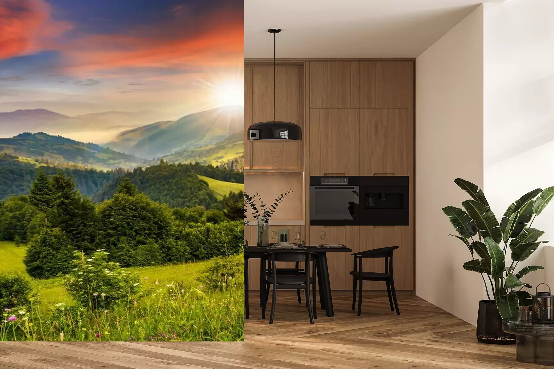 Het materiaal Premium+ is een gestructureerd vinyl op vlies met een gewicht van 255 g/m², dat kleine oneffenheden in de muur effectief camoufleert. De subtiele structuur van fijn zand geeft het oppervlak een exclusieve uitstraling, terwijl de halfmatte afwerking de diepte van de kleuren benadrukt. Het materiaal is dampdoorlatend, waardoor het ook in de keuken en badkamer kan worden gebruikt. De maximale breedte van één baan bedraagt 100 cm – bij grotere afmetingen wordt het fotobehang in meerdere gelijke banen verdeeld. De lijm wordt direct op de muur aangebracht en het behang wordt rand-aan-rand geplakt, wat zorgt voor een esthetisch resultaat zonder zichtbare naden. Het oppervlak kan gemakkelijk worden schoongemaakt door het voorzichtig af te nemen met een vochtige doek.