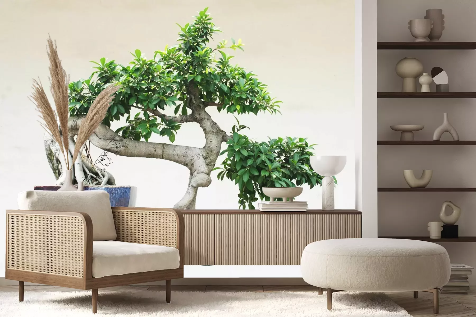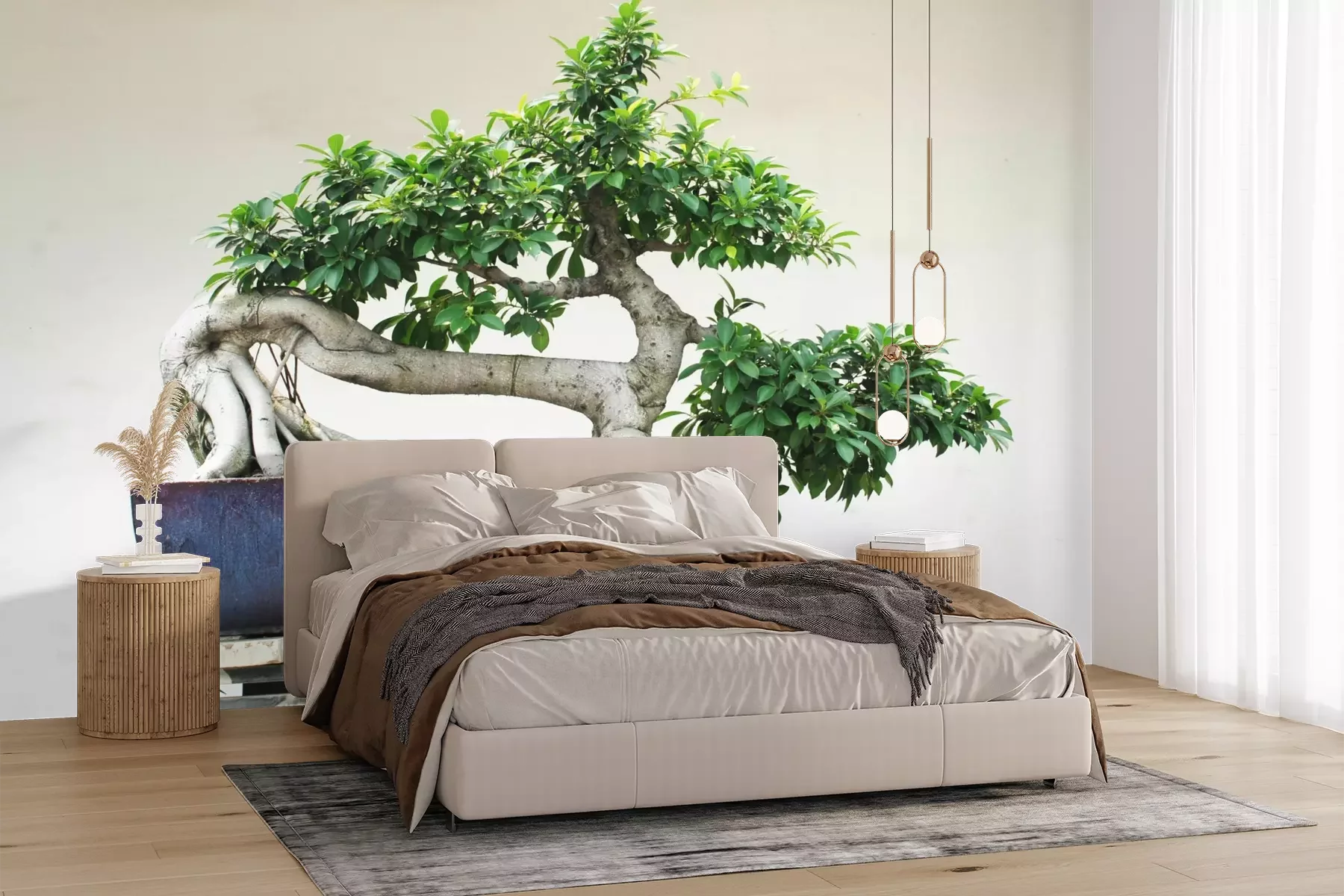 Het materiaal Premium+ is een gestructureerd vinyl op vlies met een gewicht van 255 g/m², dat kleine oneffenheden in de muur effectief camoufleert. De subtiele structuur van fijn zand geeft het oppervlak een exclusieve uitstraling, terwijl de halfmatte afwerking de diepte van de kleuren benadrukt. Het materiaal is dampdoorlatend, waardoor het ook in de keuken en badkamer kan worden gebruikt. De maximale breedte van één baan bedraagt 100 cm – bij grotere afmetingen wordt het fotobehang in meerdere gelijke banen verdeeld. De lijm wordt direct op de muur aangebracht en het behang wordt rand-aan-rand geplakt, wat zorgt voor een esthetisch resultaat zonder zichtbare naden. Het oppervlak kan gemakkelijk worden schoongemaakt door het voorzichtig af te nemen met een vochtige doek.