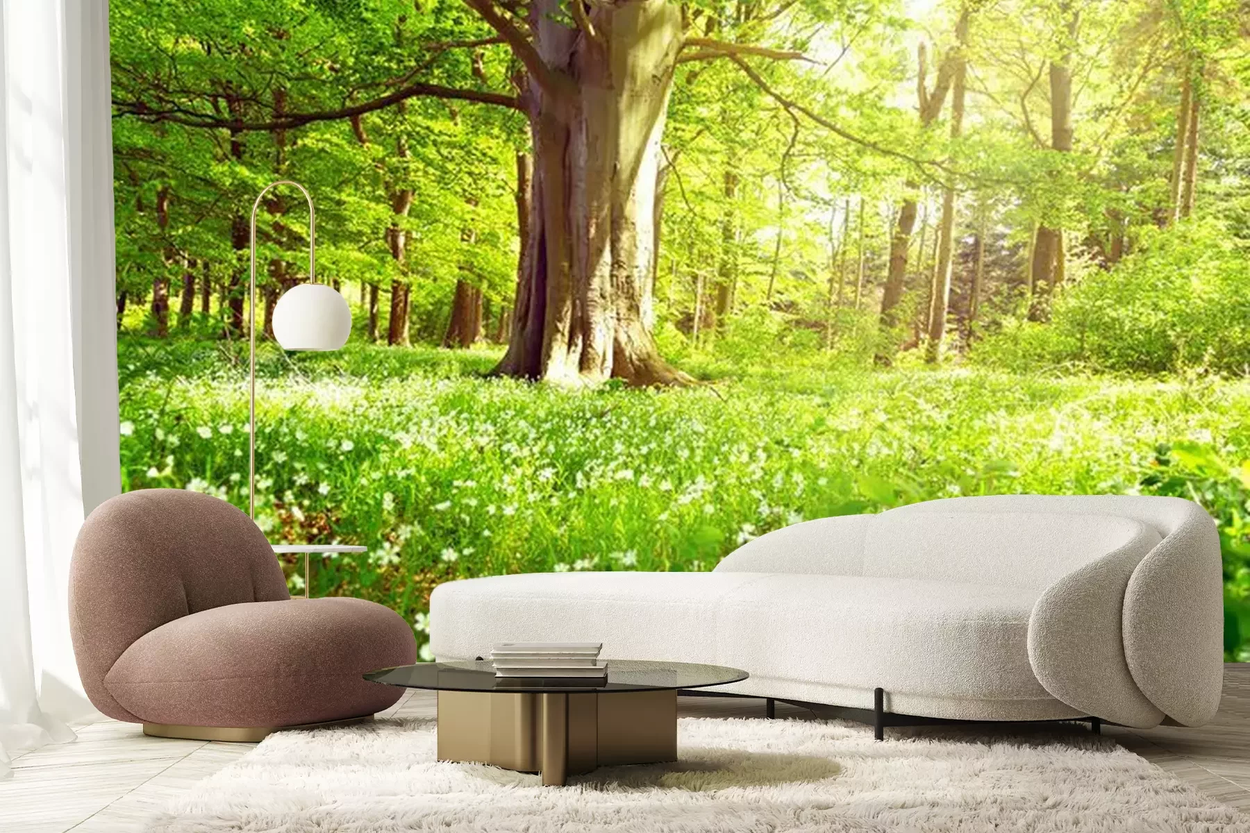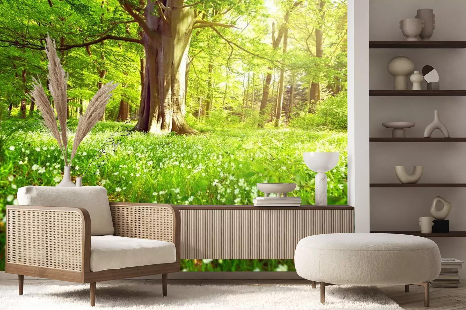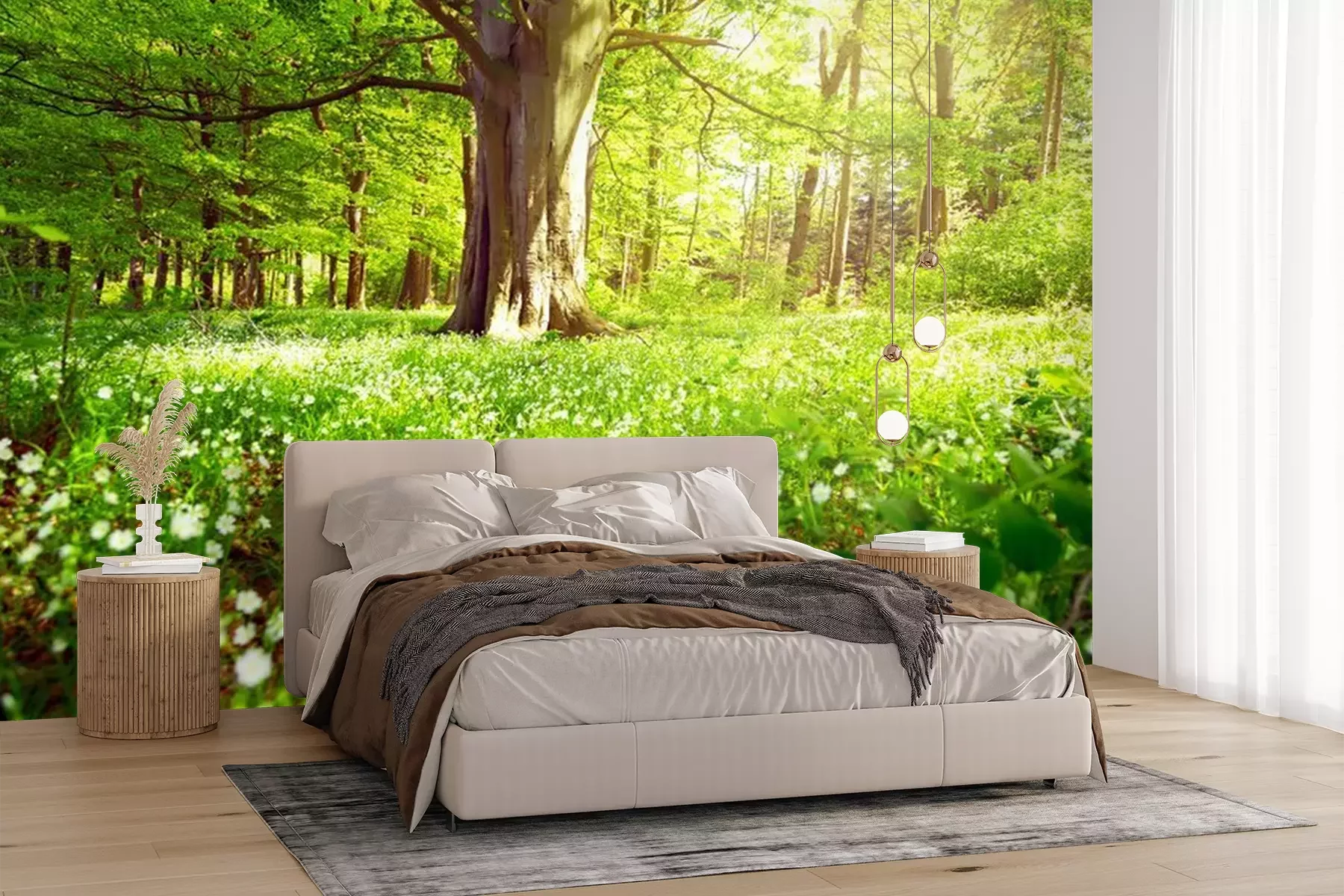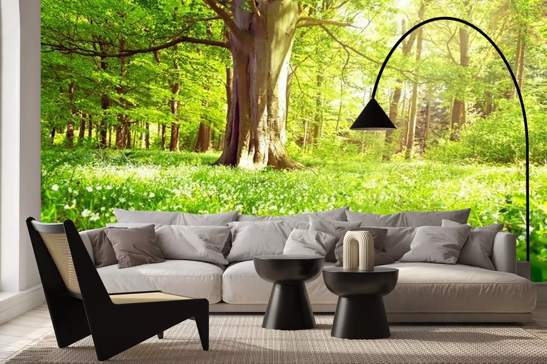 Een loofbos in de lente, vol frisgroen.Fotobehang