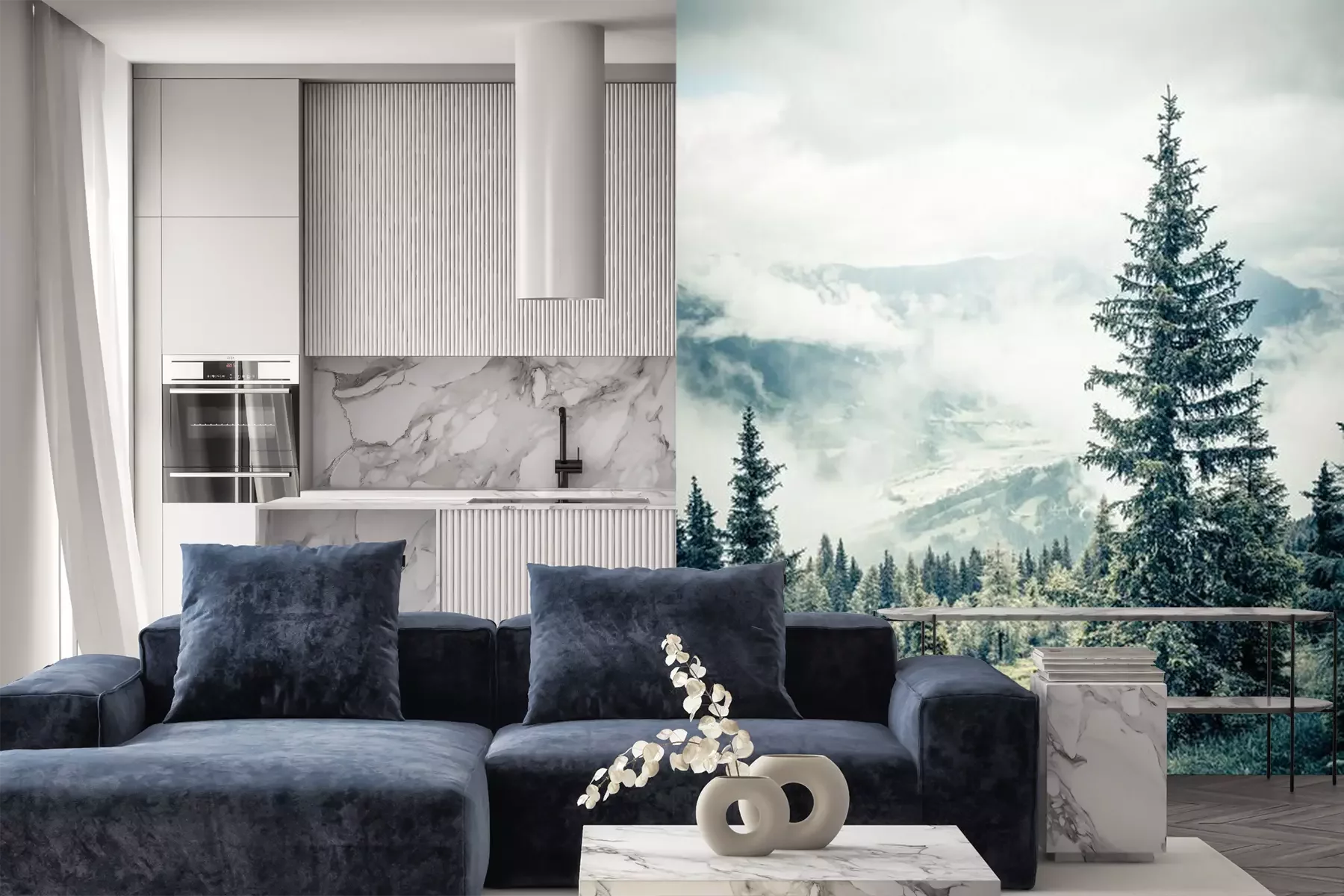 Het materiaal Premium is een glad vinyl op vlies, dat bestand is tegen uitrekken en vervorming. Het is dampdoorlatend – de muren kunnen vrij ademen – waardoor het geschikt is voor gebruik in de keuken en badkamer. Bij vervuiling kan het materiaal worden afgenomen met een vochtige doek. De maximale breedte van één baan bedraagt 95 of 105 cm, afhankelijk van de beschikbaarheid. Montage vindt plaats met de rand-aan-rand methode, wat een esthetisch resultaat zonder zichtbare naden oplevert. Omdat de lijm rechtstreeks op de muur wordt aangebracht, verloopt de installatie van het fotobehang snel en eenvoudig.