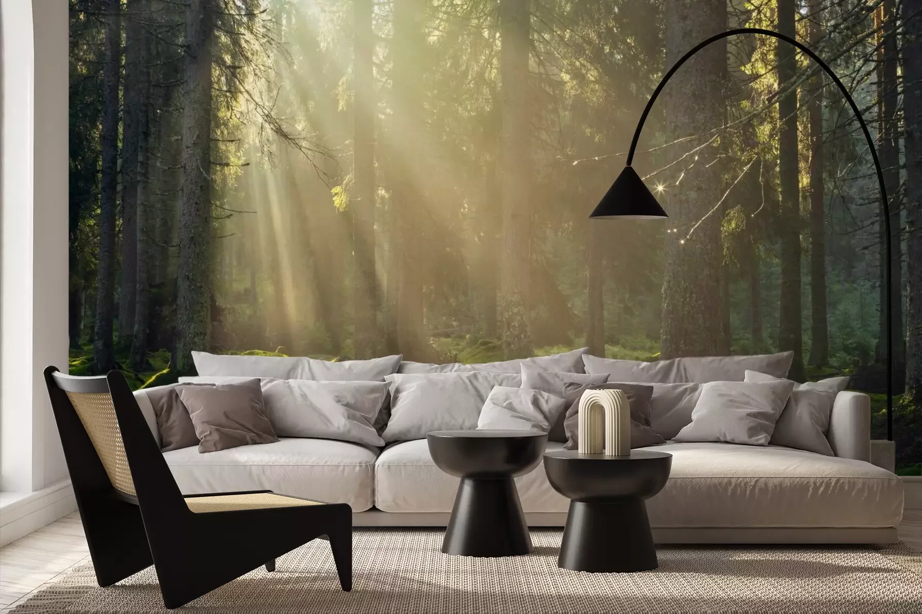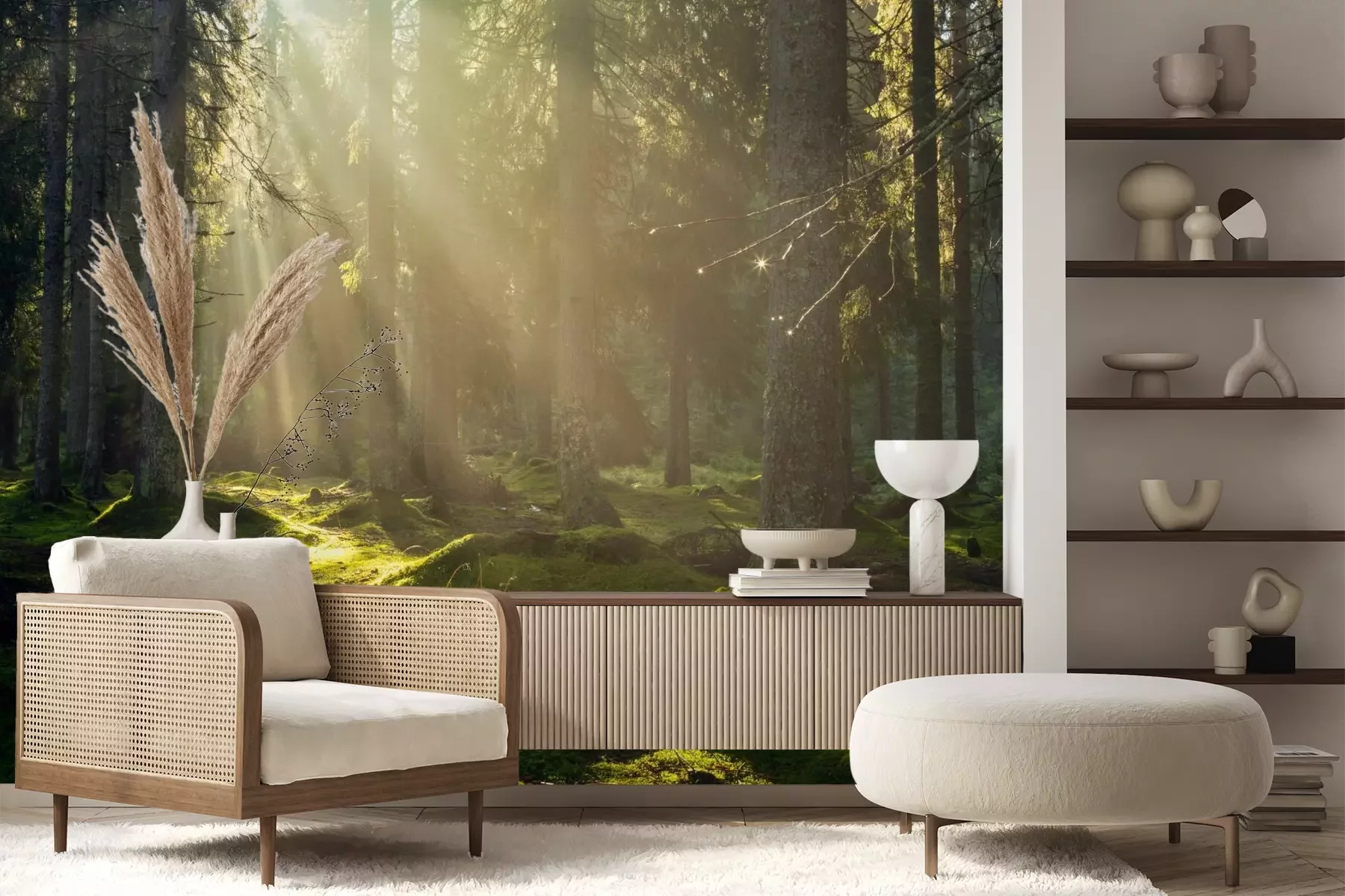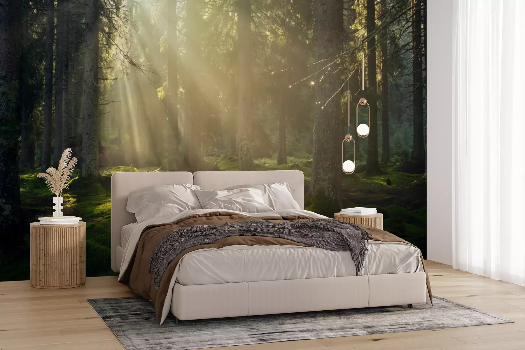 Het materiaal Premium+ is een gestructureerd vinyl op vlies met een gewicht van 255 g/m², dat kleine oneffenheden in de muur effectief camoufleert. De subtiele structuur van fijn zand geeft het oppervlak een exclusieve uitstraling, terwijl de halfmatte afwerking de diepte van de kleuren benadrukt. Het materiaal is dampdoorlatend, waardoor het ook in de keuken en badkamer kan worden gebruikt. De maximale breedte van één baan bedraagt 100 cm – bij grotere afmetingen wordt het fotobehang in meerdere gelijke banen verdeeld. De lijm wordt direct op de muur aangebracht en het behang wordt rand-aan-rand geplakt, wat zorgt voor een esthetisch resultaat zonder zichtbare naden. Het oppervlak kan gemakkelijk worden schoongemaakt door het voorzichtig af te nemen met een vochtige doek.
