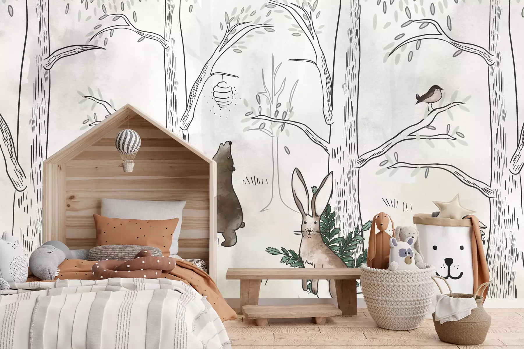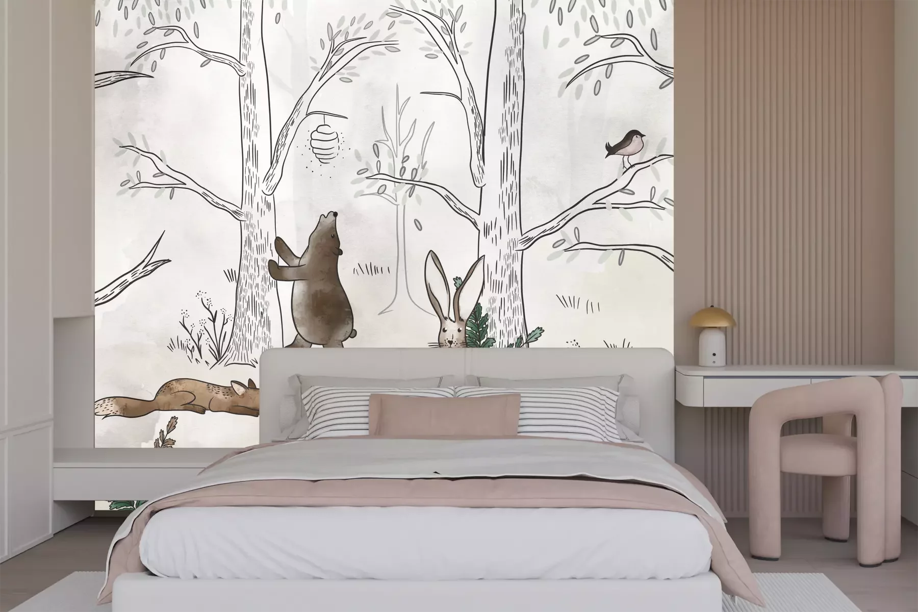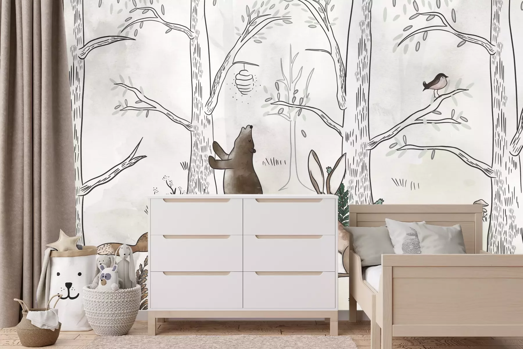 Als je op zoek bent naar een idee voor een opvallende decoratie van de kinderkamer, is het hier gepresenteerde fotobehang een uitstekende keuze. Bosdieren zijn een motief dat erg populair is, omdat het toelaat een vleugje natuur in het interieur te brengen – wat vooral waardevol is als je in de stad woont. Wanneer zo’n fotobehang op de muur verschijnt, lijken de door kinderen geliefde dieren binnen handbereik en ontstaat er een vriendelijke, charmante sfeer. De minimalistische esthetiek van het patroon verdient bijzondere aandacht. De compositie is uitgevoerd in een gedempt kleurenpalet, gebaseerd op natuurlijke, aardse tinten, waardoor een gezellige en zintuiglijk rustgevende omgeving ontstaat. We hebben een aantal ideeën over kinderfotobehang in welke stijlen ons goed tot zijn recht komt. Dieren die zich verschuilen in het dichte bos passen perfect bij Scandinavische, eco- of boho-inrichtingen. Dankzij de neutrale achtergrond komen de dieren op de voorgrond te staan, trekken ze de aandacht en stimuleren ze de kinderlijke verbeelding. Het patroon komt het beste tot zijn recht boven het bedje of in een speelhoek – het wordt dan niet alleen een decoratief element, maar ook een inspiratiebron voor creatieve activiteiten. Een belangrijk aspect zijn de hoogwaardige materialen waarvan ons fotobehang is gemaakt. Bosdieren kunnen gerust ook in een babykamer worden aangebracht – de decoratie is ecologisch, geurloos en volledig veilig voor de gezondheid, zoals bevestigd door talrijke certificaten. Bovendien zijn de banen krasbestendig en kunnen eventuele vlekken gemakkelijk worden verwijderd – een groot voordeel bij het inrichten van een kinderkamer met fotobehang. Bosdieren zijn niet alleen een uitstekende oplossing voor thuis, maar ook een perfecte keuze voor crèches, kleuterscholen of andere educatieve instellingen. Zo’n muurdecoratie maakt het mogelijk om in enkele ogenblikken een knusse en tegelijk stimulerende ruimte te creëren. Ook de universele uitstraling van dit fotobehang verdient vermelding– bosdieren spreken zowel jongens als meisjes aan, waardoor je gemakkelijk een inrichting kunt creëren waarin elk kind zich op zijn gemak voelt.