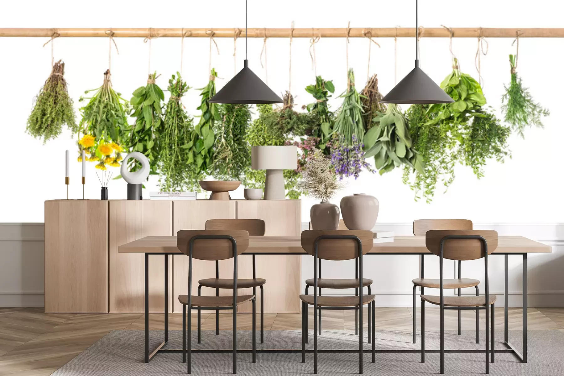 Kruiden hangend aan een houten balkFotobehang