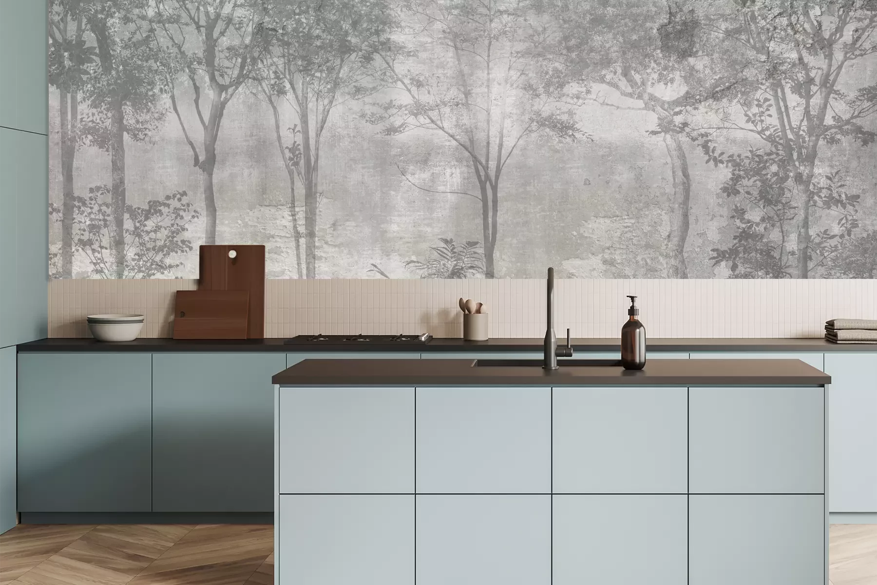 Het materiaal Premium is een glad vinyl op vlies, dat bestand is tegen uitrekken en vervorming. Het is dampdoorlatend – de muren kunnen vrij ademen – waardoor het geschikt is voor gebruik in de keuken en badkamer. Bij vervuiling kan het materiaal worden afgenomen met een vochtige doek. De maximale breedte van één baan bedraagt 95 of 105 cm, afhankelijk van de beschikbaarheid. Montage vindt plaats met de rand-aan-rand methode, wat een esthetisch resultaat zonder zichtbare naden oplevert. Omdat de lijm rechtstreeks op de muur wordt aangebracht, verloopt de installatie van het fotobehang snel en eenvoudig.