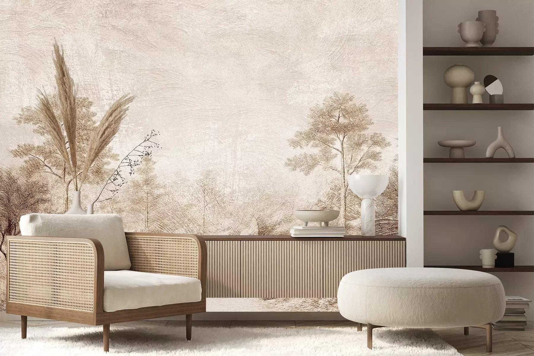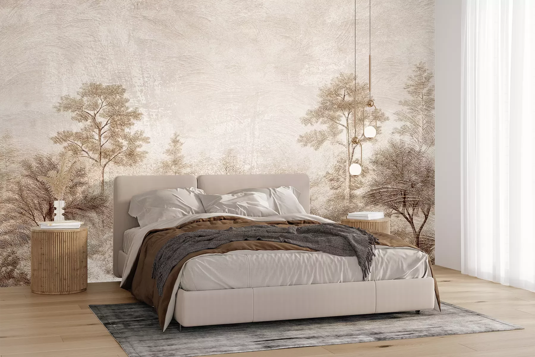 Het materiaal Premium+ is een gestructureerd vinyl op vlies met een gewicht van 255 g/m², dat kleine oneffenheden in de muur effectief camoufleert. De subtiele structuur van fijn zand geeft het oppervlak een exclusieve uitstraling, terwijl de halfmatte afwerking de diepte van de kleuren benadrukt. Het materiaal is dampdoorlatend, waardoor het ook in de keuken en badkamer kan worden gebruikt. De maximale breedte van één baan bedraagt 100 cm – bij grotere afmetingen wordt het fotobehang in meerdere gelijke banen verdeeld. De lijm wordt direct op de muur aangebracht en het behang wordt rand-aan-rand geplakt, wat zorgt voor een esthetisch resultaat zonder zichtbare naden. Het oppervlak kan gemakkelijk worden schoongemaakt door het voorzichtig af te nemen met een vochtige doek.