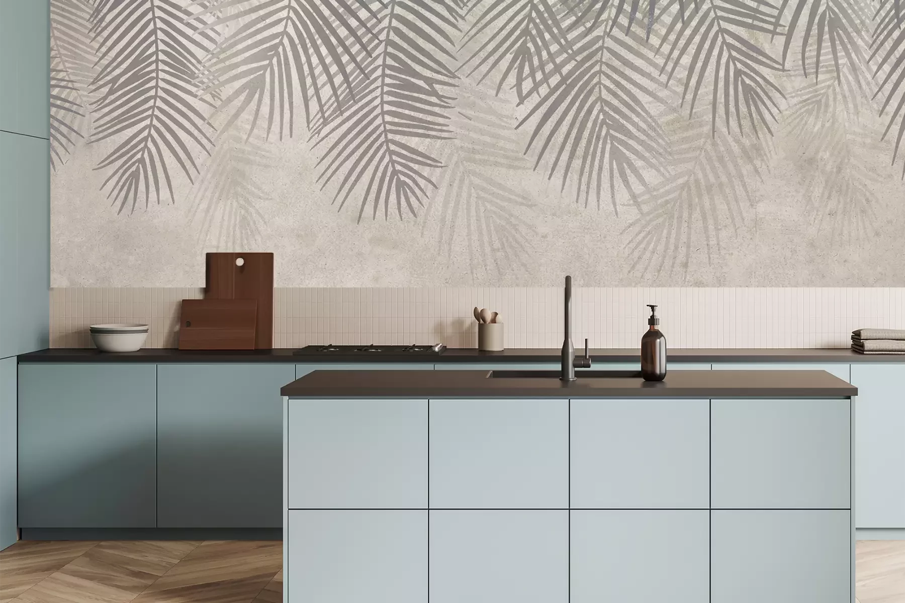 Het materiaal Premium is een glad vinyl op vlies, dat bestand is tegen uitrekken en vervorming. Het is dampdoorlatend – de muren kunnen vrij ademen – waardoor het geschikt is voor gebruik in de keuken en badkamer. Bij vervuiling kan het materiaal worden afgenomen met een vochtige doek. De maximale breedte van één baan bedraagt 95 of 105 cm, afhankelijk van de beschikbaarheid. Montage vindt plaats met de rand-aan-rand methode, wat een esthetisch resultaat zonder zichtbare naden oplevert. Omdat de lijm rechtstreeks op de muur wordt aangebracht, verloopt de installatie van het fotobehang snel en eenvoudig.