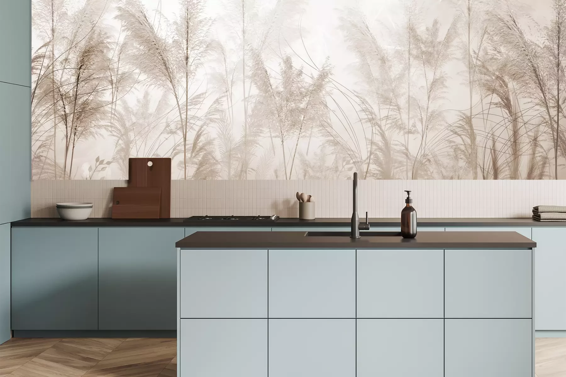 Het materiaal Premium is een glad vinyl op vlies, dat bestand is tegen uitrekken en vervorming. Het is dampdoorlatend – de muren kunnen vrij ademen – waardoor het geschikt is voor gebruik in de keuken en badkamer. Bij vervuiling kan het materiaal worden afgenomen met een vochtige doek. De maximale breedte van één baan bedraagt 95 of 105 cm, afhankelijk van de beschikbaarheid. Montage vindt plaats met de rand-aan-rand methode, wat een esthetisch resultaat zonder zichtbare naden oplevert. Omdat de lijm rechtstreeks op de muur wordt aangebracht, verloopt de installatie van het fotobehang snel en eenvoudig.