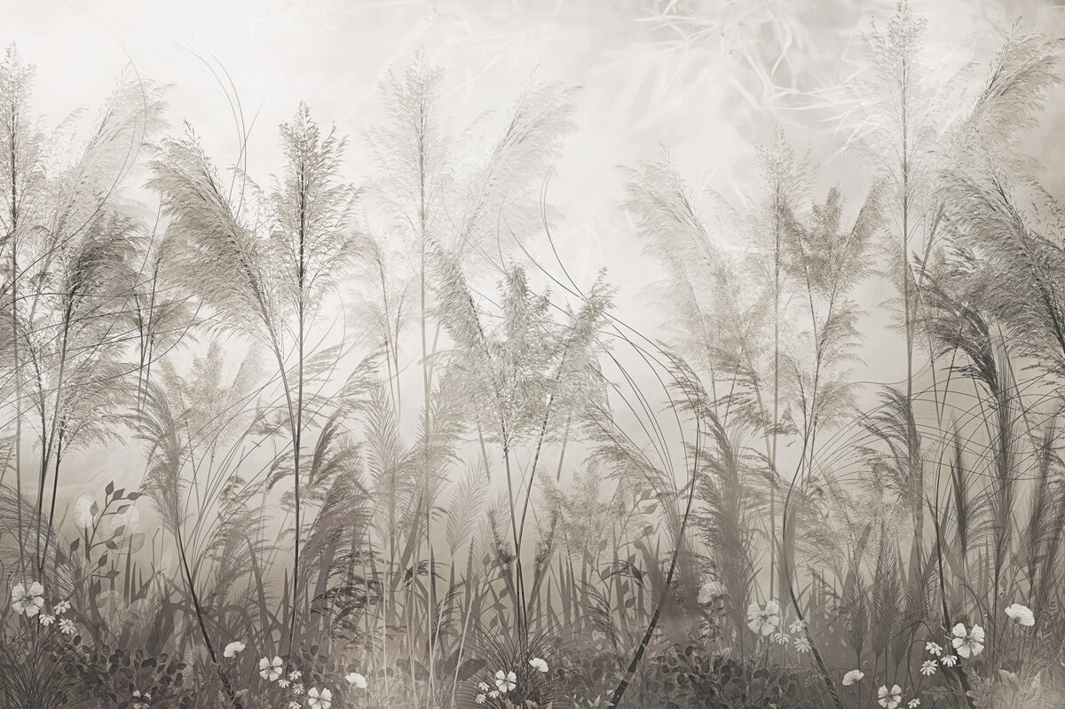 Fotobehang: Botanische samenstelling van beige grassen en witte bloemen