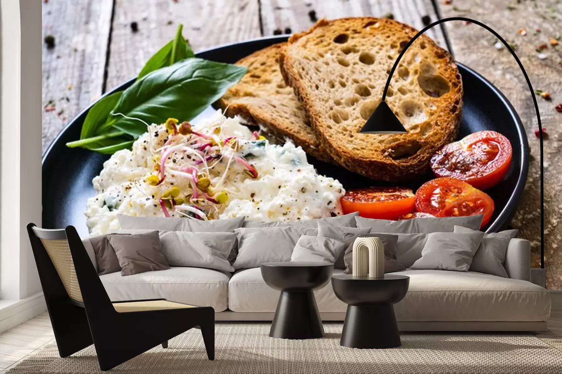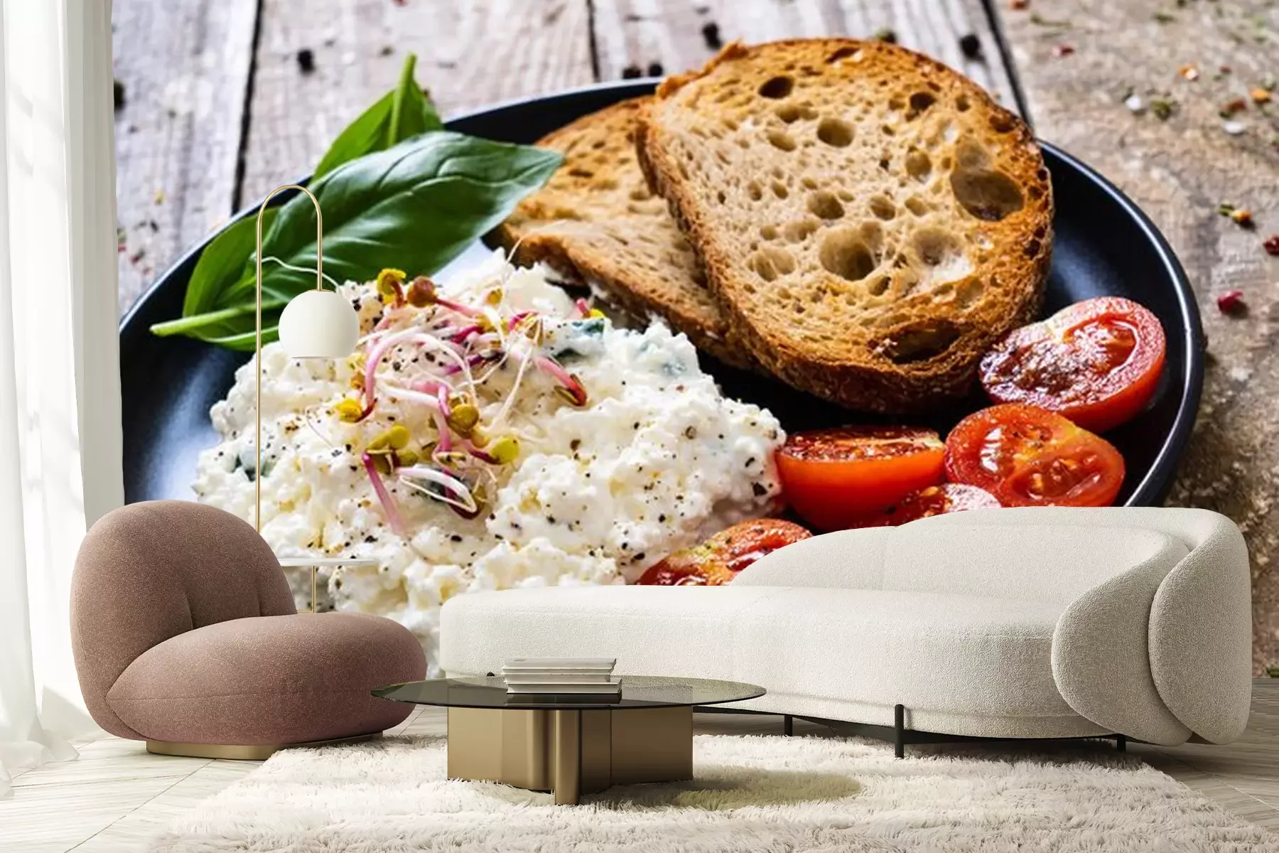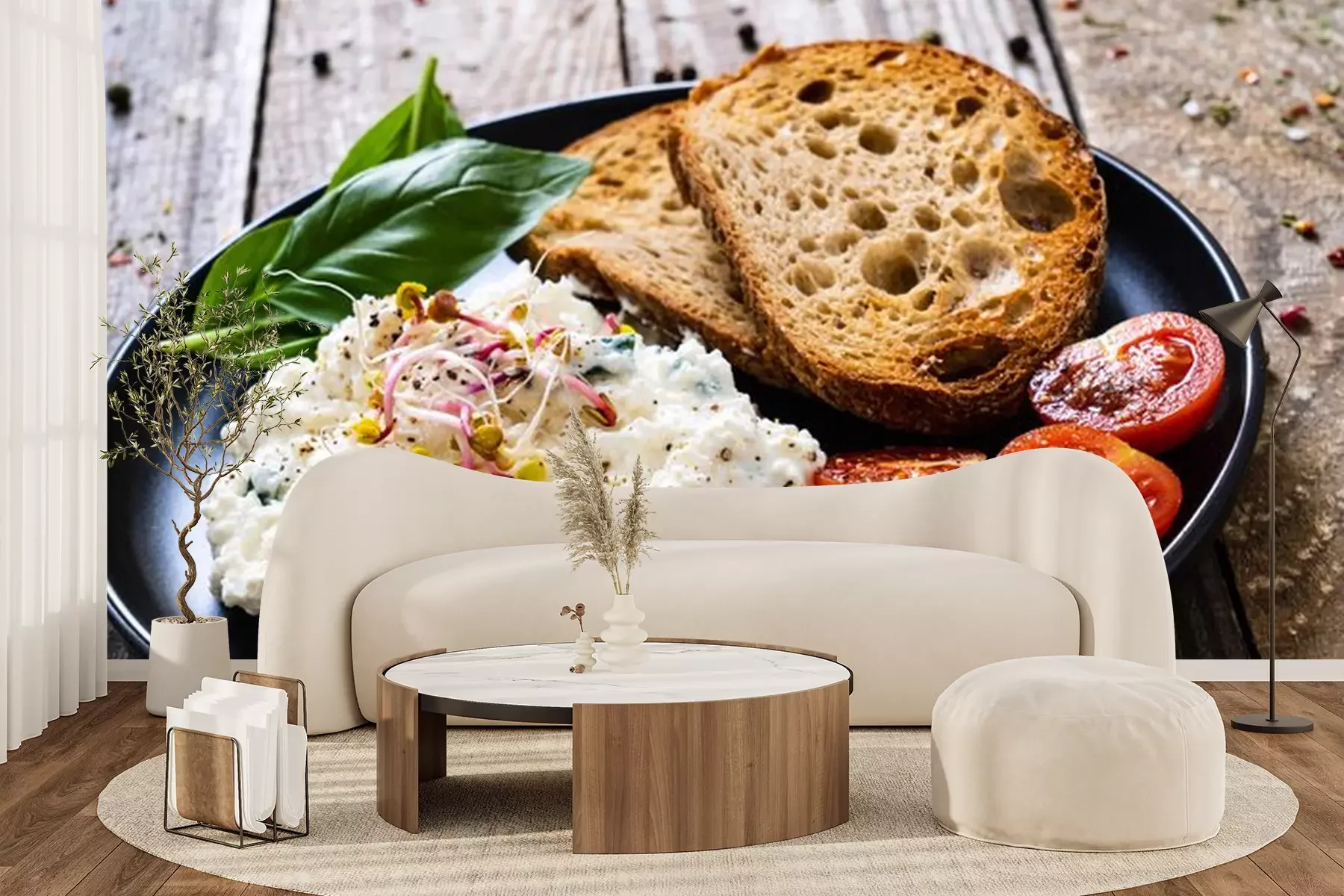 Fotobehang Breakfast - cottage cheese, toasts and vegetables