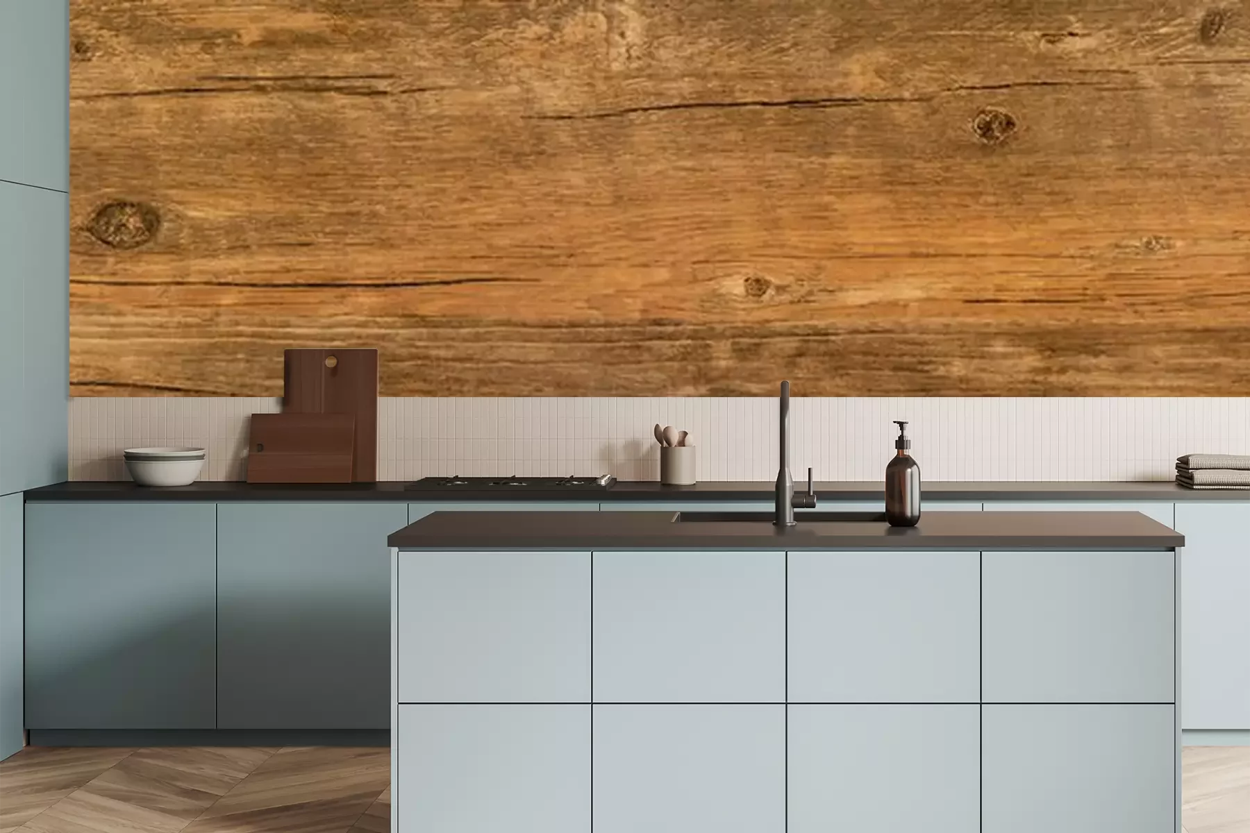 Het materiaal Premium is een glad vinyl op vlies, dat bestand is tegen uitrekken en vervorming. Het is dampdoorlatend – de muren kunnen vrij ademen – waardoor het geschikt is voor gebruik in de keuken en badkamer. Bij vervuiling kan het materiaal worden afgenomen met een vochtige doek. De maximale breedte van één baan bedraagt 95 of 105 cm, afhankelijk van de beschikbaarheid. Montage vindt plaats met de rand-aan-rand methode, wat een esthetisch resultaat zonder zichtbare naden oplevert. Omdat de lijm rechtstreeks op de muur wordt aangebracht, verloopt de installatie van het fotobehang snel en eenvoudig.