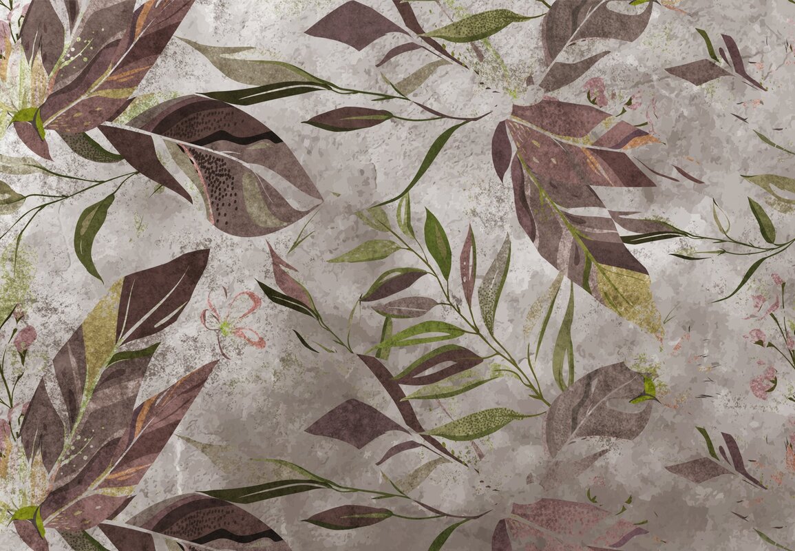 Fotobehang: Bruine en groene bladeren op een betonnen achtergrond