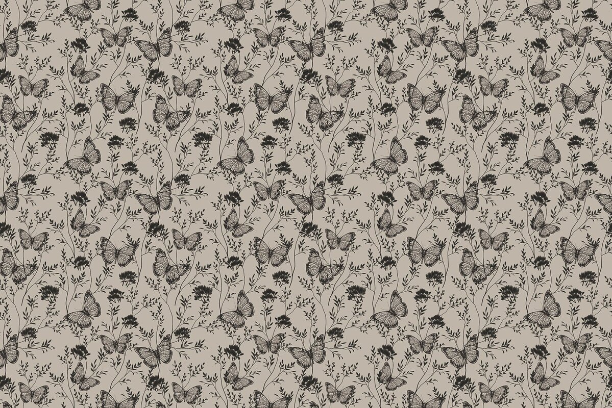 Fotobehang: Butterflies among wildflowers, monochromatic retro botanical pattern motif